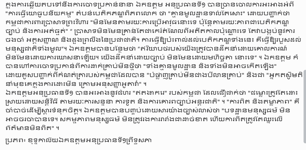 ឯកឧត្តមអនុប្រធានទី១ បានគូសបញ្ជាក់ថា កម្ពុជាជាប្រជាជាតិដែល “បានរងទុក្ខវេទនាយ៉ាងខ្លាំងកាលពីអតីតកាល” ហើយ “ស្រឡាញ់និងការពារសុខសន្តិភាព” ជាមូលដ្ឋានគ្រឹះនៃការអភិវឌ្ឍជាតិ ។ កម្ពុជា “គ្មានបំណងចង់មានទំនាស់ជាមួយប្រទេសណាមួយឡើយ ជាពិសេសថៃ” ប៉ុន្តែ “ដើម្បីការពិត យើងខ្ញុំមានភាពចាំបាច់ត្រូវធ្វើការឆ្លើយតប” ។