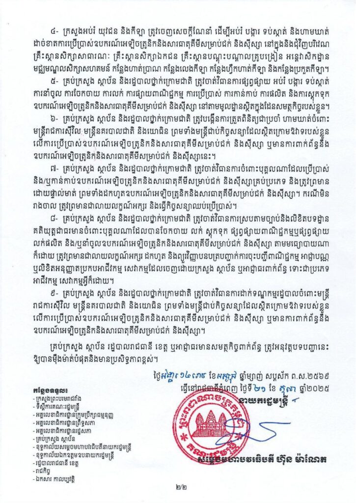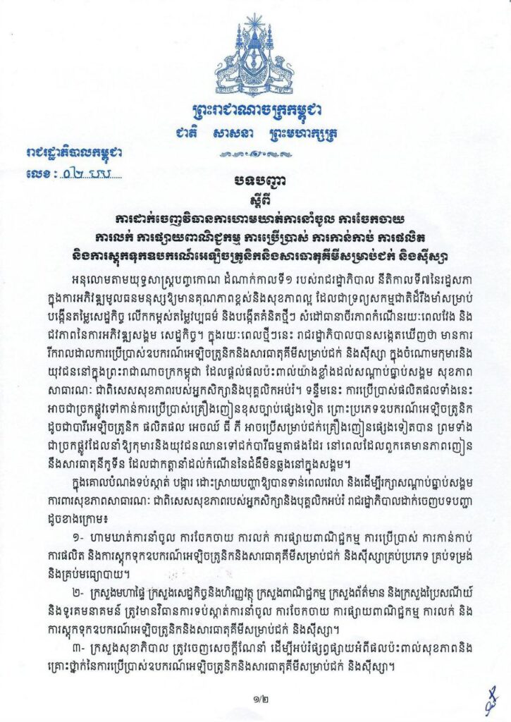 (ភ្នំពេញ)៖ រាជរដ្ឋាភិបាលកម្ពុជា ចេញបទបញ្ជាស្តីពី ការដាក់ ចេញ វិធាន ការ ហាម ឃាត់ ការនាំចូល ការចែកចាយ ការលក់ ការផ្សាយពាណិជ្ជកម្ម ការ ប្រើប្រាស់ ការកាន់កាប់ ការផលិត និងការ ស្តុក ទុក ឧបករណ៍ អេឡិច ត្រូនិក និងសារធាតុគីមីសម្រាប់ជក់ និងស៊ីស្សា ។ នេះបើតាមបទបញ្ជា ចុះថ្ងៃទី២១ ខែតុលា ឆ្នាំ២០២៥ ។