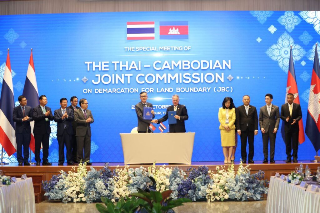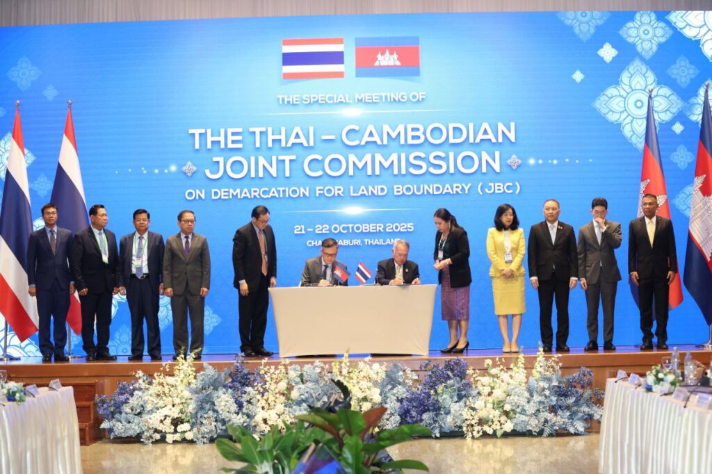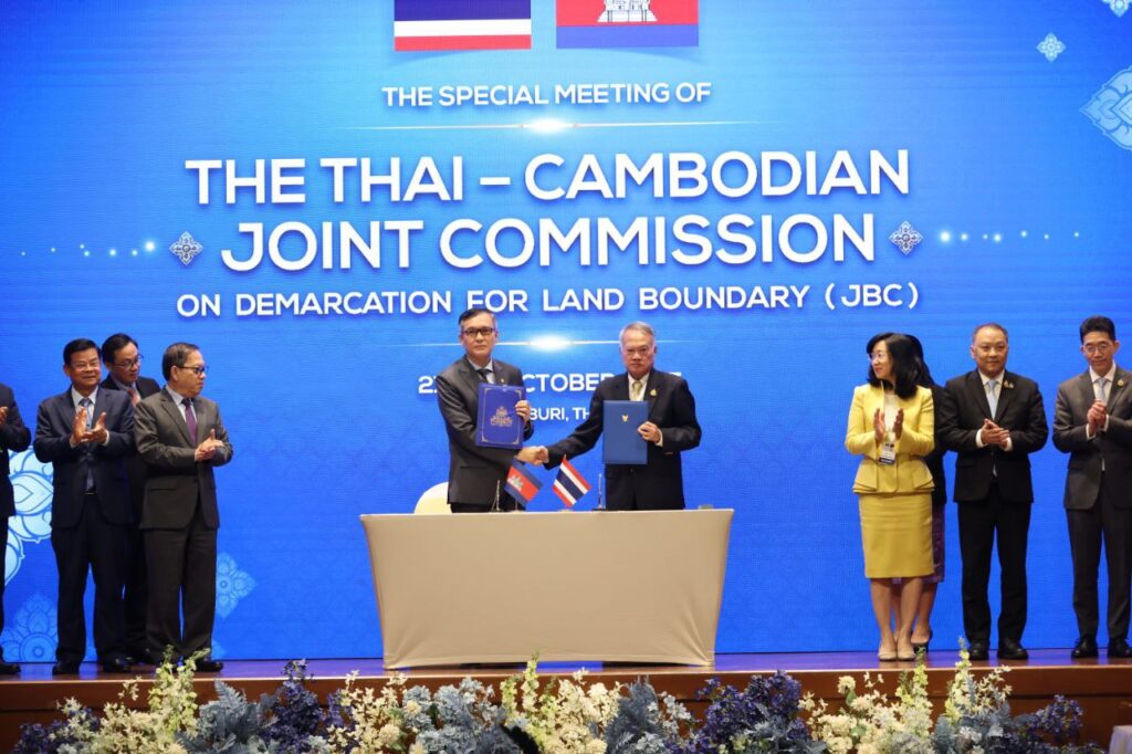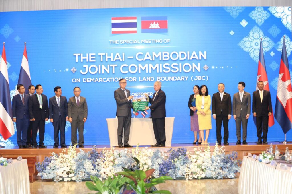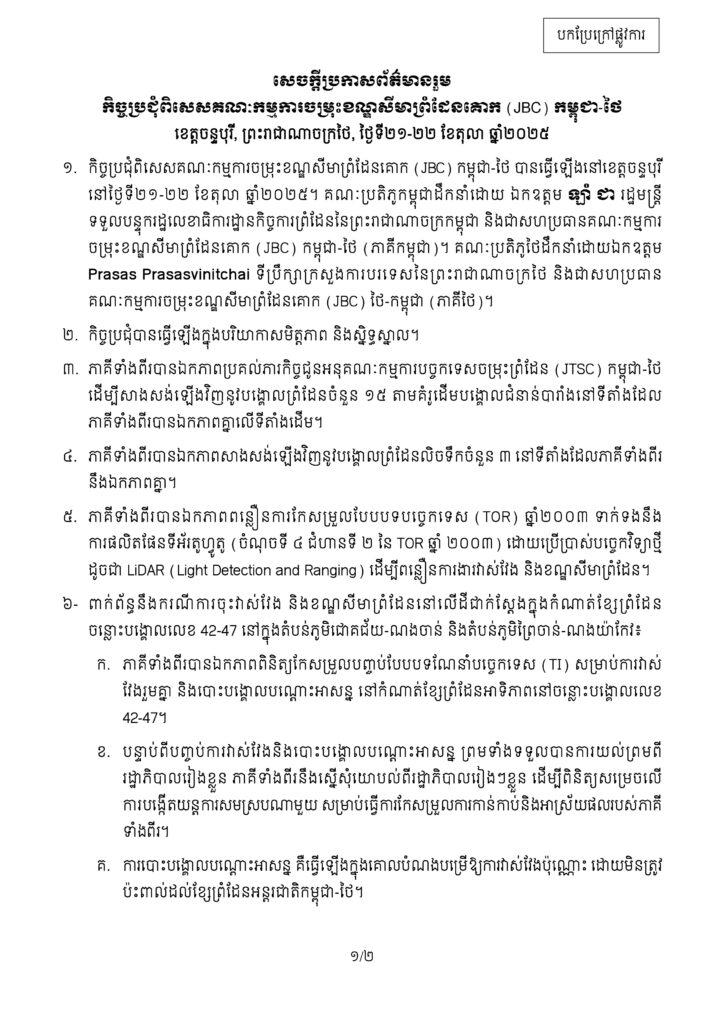 ១. កិច្ចប្រជុំពិសេសគណៈកម្មការចម្រុះខណ្ឌសីមាព្រំដែនគោក (JBC) កម្ពុជា-ថៃ បានធ្វើឡើងនៅខេត្តចន្ទបុរី នៅថ្ងៃទី២១-២២ ខែតុលា ឆ្នាំ២០២៥។ គណៈប្រតិភូកម្ពុជាដឹកនាំដោយ ឯកឧត្តម ឡាំ ជា រដ្ឋមន្ត្រី ទទួលបន្ទុករដ្ឋលេខាធិការដ្ឋានកិច្ចការព្រំដែននៃព្រះរាជាណាចក្រកម្ពុជា និងជាសហប្រធានគណៈកម្មការ ចម្រុះខណ្ឌសីមាព្រំដែនគោក (JBC) កម្ពុជា-ថៃ (ភាគីកម្ពុជា)។ គណៈប្រតិភូថៃដឹកនាំដោយឯកឧត្តម Prasas Prasasvinitchai ទីប្រឹក្សាក្រសួងការបរទេសនៃព្រះរាជាណាចក្រថៃ និងជាសហប្រធាន គណៈកម្មការចម្រុះខណ្ឌសីមាព្រំដែនគោក (JBC) ថៃ-កម្ពុជា (ភាគីថៃ)។