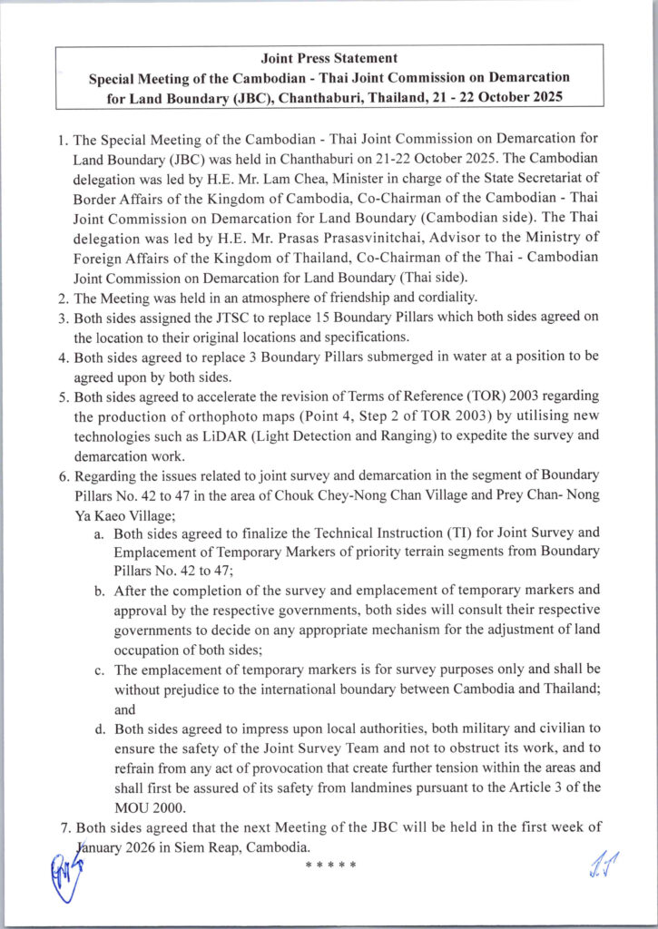 ៧. ភាគីទាំងពីរបានឯកភាពថា កិច្ចប្រជុំបន្ទាប់របស់គណៈកម្មការចម្រុះខណ្ឌសីមាព្រំដែនគោក (JBC) នឹង ប្រព្រឹត្តទៅនៅសប្តាហ៍ទីមួយនៃខែមករា ឆ្នាំ ២០២៦ នៅខេត្តសៀមរាប ព្រះរាជាណាចក្រកម្ពុជា។