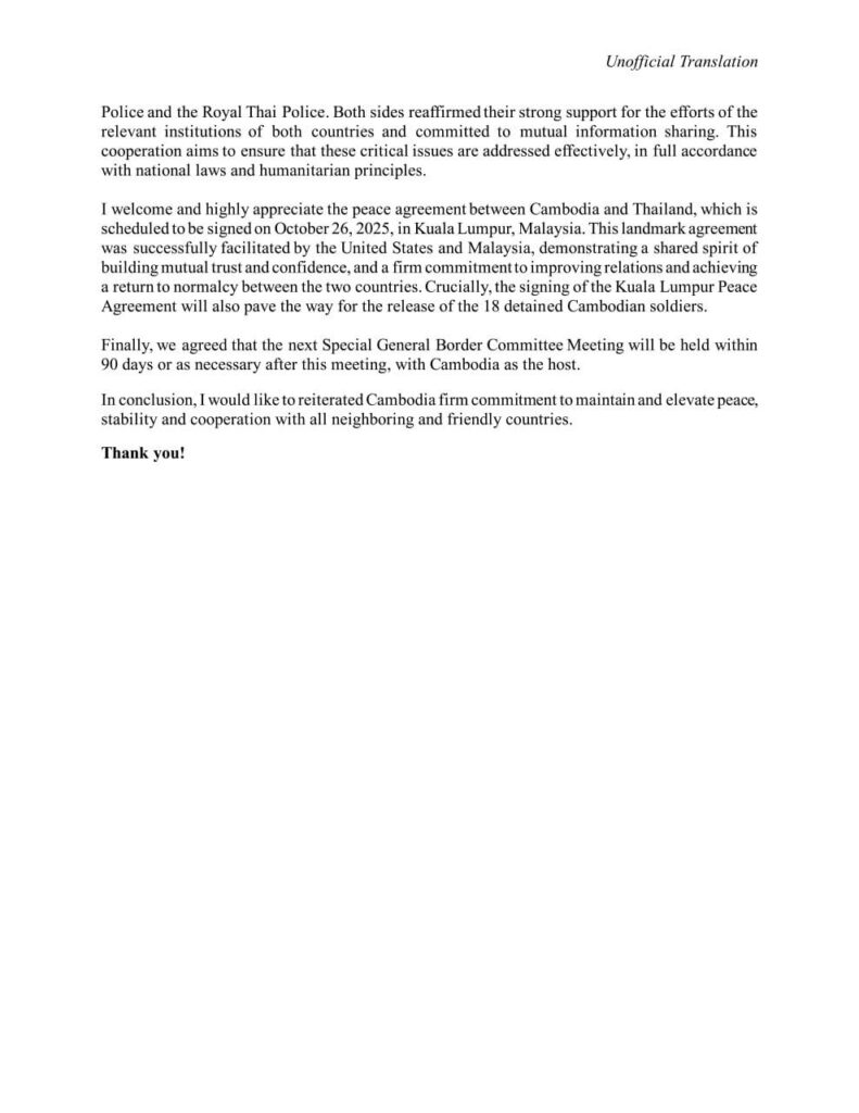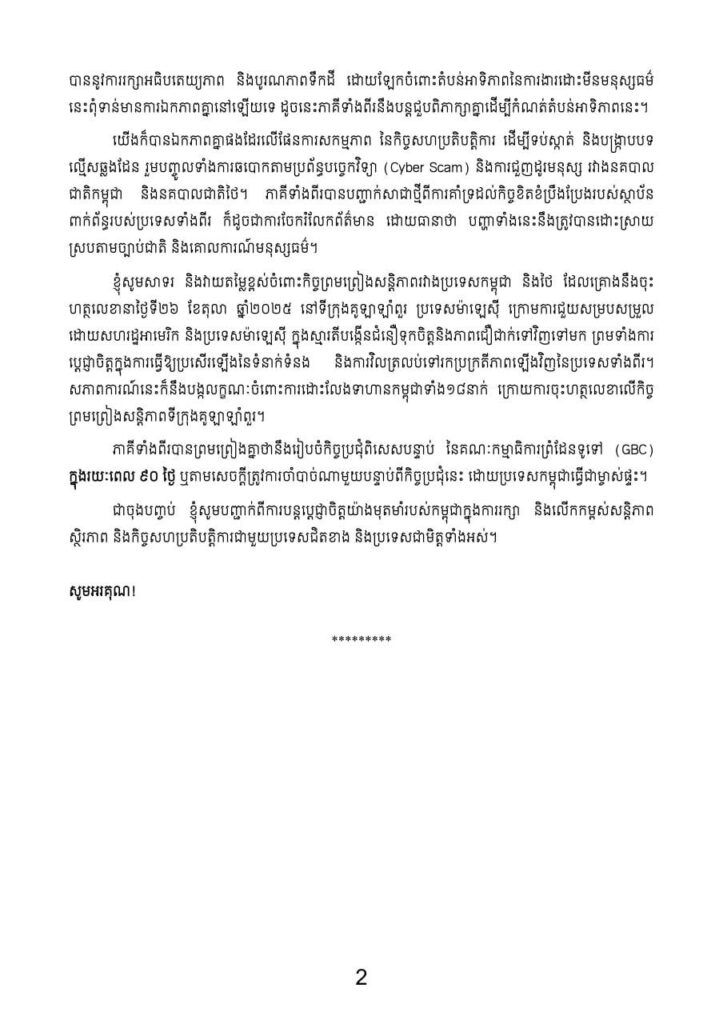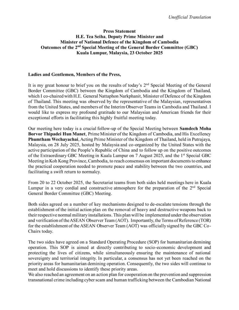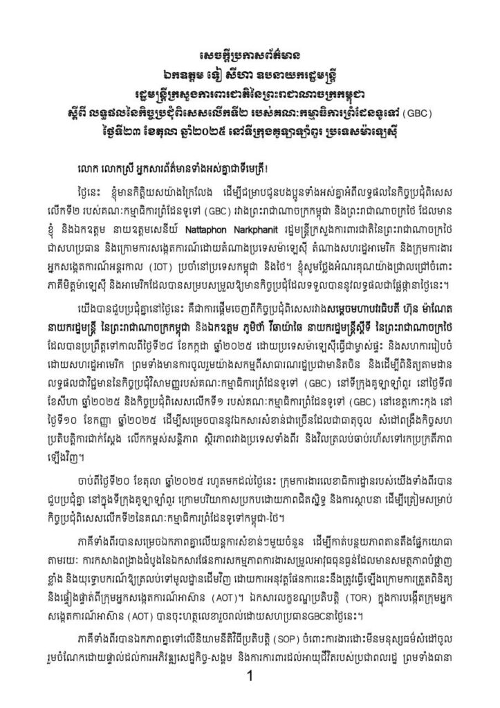 សេចក្តីប្រកាសព័ត៌មានស្ដីពី លទ្ធផលនៃកិច្ចប្រជុំពិសេសលើកទី២ របស់គណៈកម្មាធិការព្រំដែនទូទៅ (GBC) ថ្ងៃទី២៣ ខែតុលា ឆ្នាំ២០២៥ នៅទីក្រុងគូឡាឡាំពួរ ប្រទេសម៉ាឡេស៊ី។