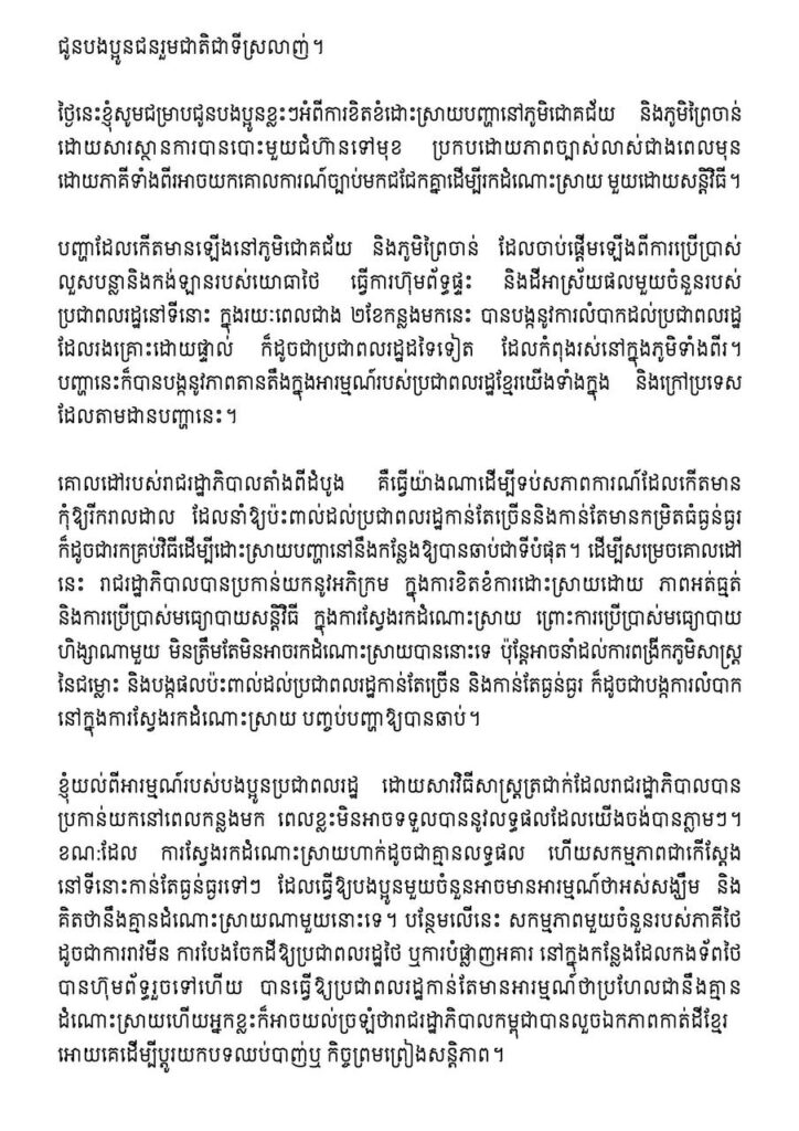 ខ្ញុំសូមបញ្ជាក់សាជាថ្មីថា គ្មានការលួចឯកភាពនៅក្នុងការកាត់ទឹកដីដែលស្ថិតនៅក្នុងដែនអធិបតេយ្យ ស្របច្បាប់របស់កម្ពុជាណាមួយទៅឱ្យប្រទេសណាមួយ ដើម្បីដោះដូរជាមួយនឹងការចរចាបទឈប់បាញ់ឬការចរចាសន្តិភាពនោះទេ។ កម្ពុជាមិនរំលោភបំពានលើដែនអធិបតេយ្យ និងបូរណភាពទឹកដីរបស់ប្រទេសជិតខាងនោះទេ ប៉ុន្តែកម្ពុជាក៏មិនយល់ព្រមឱ្យមានការរំលោភបំពានលើដែនអធិបតេយ្យ និងបូរណភាពទឹកដីរបស់កម្ពុជានោះដែរ។