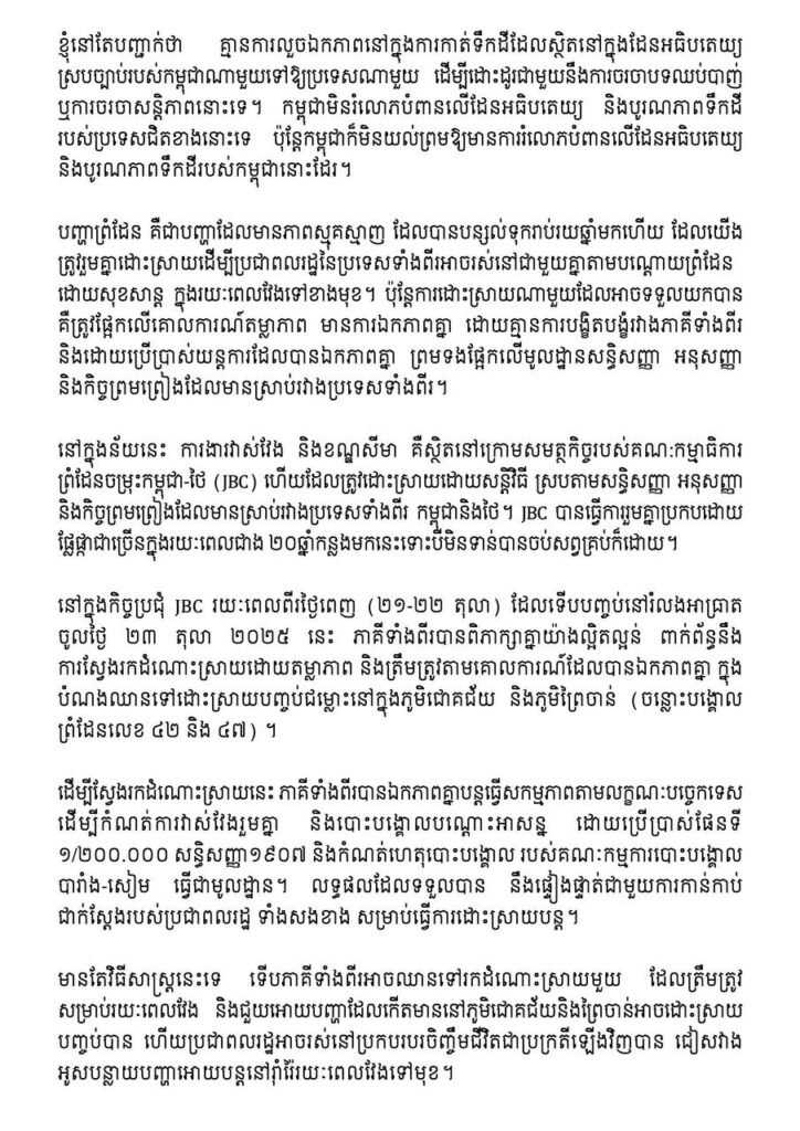 នៅក្នុងកិច្ចប្រជុំ JBC រយៈពេលពីរថ្ងៃពេញ (២១-២២ តុលា) ដែលទើបបញ្ចប់នៅរំលងអាធ្រាតចូលថ្ងៃ ២៣ តុលា ២០២៥នេះ ភាគីទាំងពីរបានពិភាក្សាគ្នាយ៉ាងល្អិតល្អន់ ពាក់ព័ន្ធនឹងការស្វែងរកដំណោះស្រាយដោយតម្លាភាព និងត្រឹមត្រូវតាមគោលការណ៍ដែលបានឯកភាពគ្នា ក្នុងបំណងឈានទៅដោះស្រាយបញ្ចប់ជម្លោះនៅក្នុងភូមិជោគជ័យ និងភូមិព្រៃចាន់ (ចន្លោះបង្គោលព្រំដែនលេខ ៤២ និង ៤៧) ។