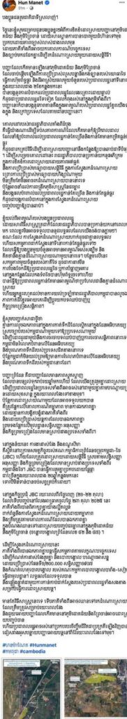 សម្ដេចធិបតី ហ៊ុន ម៉ាណែត បានជម្រាបបងប្អូនជនរួមជាតិជាទីស្រលាញ់ថា ថ្ងៃនេះ ខ្ញុំសូមជម្រាបជូនបងប្អូនខ្លះៗអំពីការខិតខំដោះស្រាយបញ្ហានៅភូមិជោគជ័យ និងភូមិព្រៃចាន់ ដោយសារស្ថានការបានបោះមួយជំហ៊ានទៅមុខ ប្រកបដោយភាពច្បាស់លាស់ជាងពេលមុន ដោយភាគីទាំងពីរអាចយកគោលការណ៍បច្ចេកទេស និងច្បាប់មកជជែកគ្នាដើម្បីរកដំណោះស្រាយមួយដោយសន្តិវិធី។