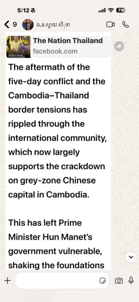 តាមរយៈបណ្ដាញសង្គមនាព្រលប់ថ្ងៃទី២៣ ខែតុលា ឆ្នាំ២០២៥ សម្ដេចតេជោ ហ៊ុន សែន បានលើកឡើងថា ក្រោយពេលអានកាសែតថៃ The Nation ចុះផ្សាយពីកម្ពុជា ខ្ញុំមានការចាំបាច់ធ្វើការណែនាំពួកគេឲ្យមានវិជ្ជាជីវៈក្នុងការសរសេរ។ អ្វីដែលខ្ញុំគួរណែនាំទៅក្រុមកាសែតអស់លោកនោះគឺថា អស់លោកគួរផ្តោតការយកចិត្តទុកដាក់លើសភាពការណ៍ផ្ទៃក្នុងថៃល្អជាង មកគិតពីអនាគតនយោបាយផ្ទៃក្នុងកម្ពុជា។