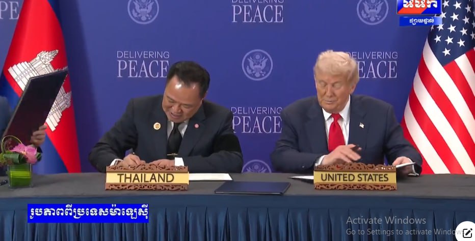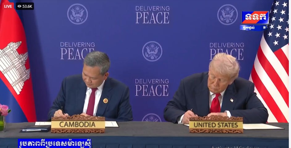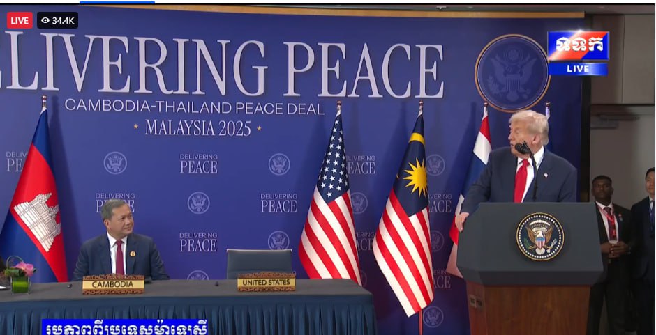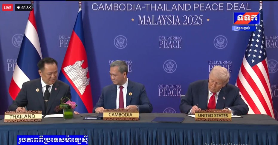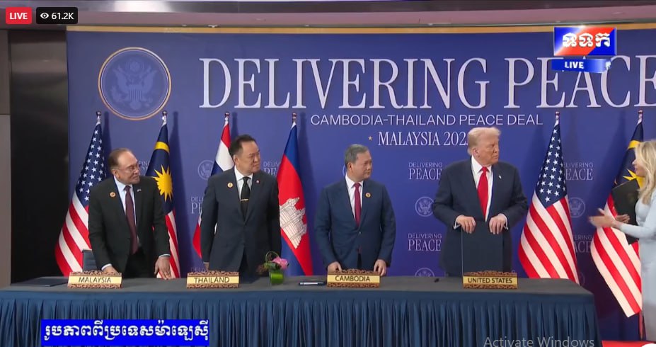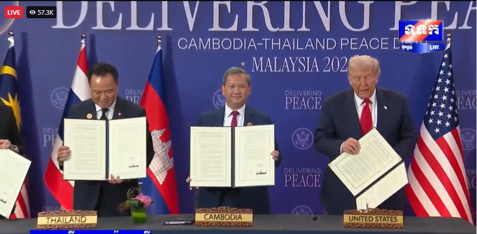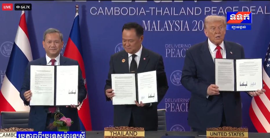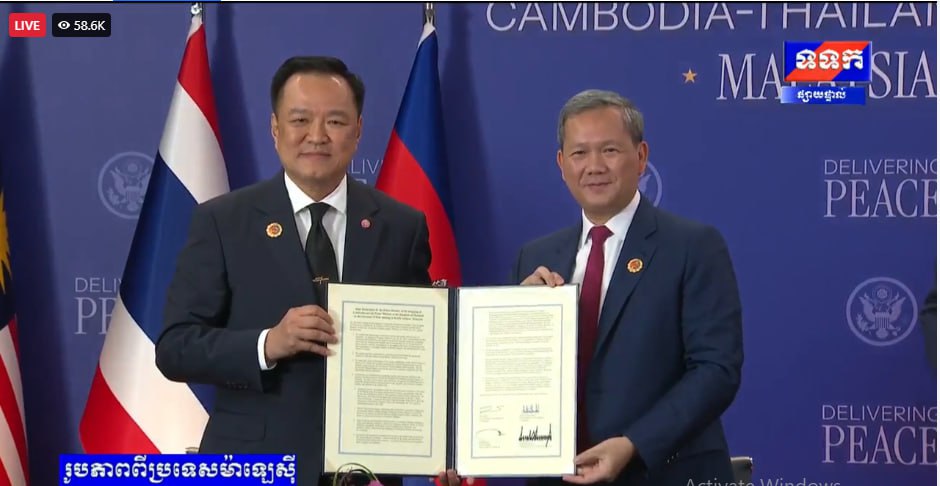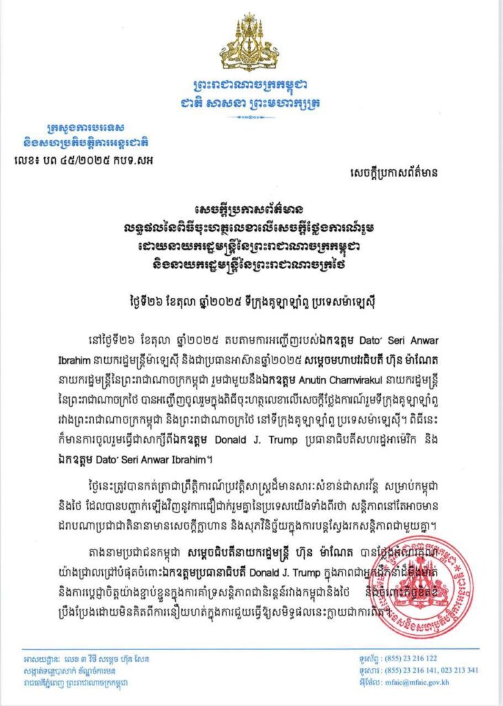 សូមជម្រាបថា នៅថ្ងៃទី២៦ ខែតុលា ឆ្នាំ២០២៥ តបតាមការអញ្ជើញរបស់ឯកឧត្តម អានវ៉ា អ៊ីប្រាហ៊ីម នាយករដ្ឋមន្ត្រីម៉ាឡេស៊ី និងជាប្រធានអាស៊ានឆ្នាំ២០២៥ សម្តេចមហាបវរធិបតី ហ៊ុន ម៉ាណែត នាយករដ្ឋមន្ត្រីនៃព្រះរាជាណាចក្រកម្ពុជា រួមជាមួយនឹងឯកឧត្តម អានុទីន ឆាAnutin Charnvirakul នាយករដ្ឋមន្ត្រី នៃព្រះរាជាណាចក្រថៃ បានអញ្ជើញចូលរួមក្នុងពិធីចុះហត្ថលេខាលើសេចក្តីថ្លែងការណ៍រួមទីក្រុងគូឡាឡាំពួ រវាងព្រះរាជាណាចក្រកម្ពុជា និងព្រះរាជាណាចក្រថៃ នៅទីក្រុងគូឡាឡាំពួ ប្រទេសម៉ាឡេស៊ី។ ពិធីនេះ ក៏មានការចូលរួមធ្វើជាសាក្សីពីឯកឧត្តម Donald J. Trump ប្រធានាធិបតីសហរដ្ឋអាម៉េរិក និង ឯកឧត្តម Dato’ Seri Anwar Ibrahim៕