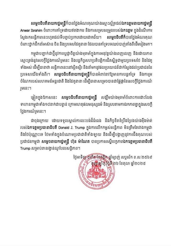 កម្ពុជា បញ្ជាក់ជាថ្មីនូវការប្តេជ្ញាចិត្តយ៉ាងមុតមាំក្នុងការអនុវត្តយ៉ាងពេញលេញ និងដោយភាព ស្មោះត្រង់នូវសេចក្តីថ្លែងការណ៍រួមនេះ និងបន្តកិច្ចសហប្រតិបត្តិការជិតស្និទ្ធជាមួយប្រទេសថៃ និងដៃគូ ទាំងអស់ ដើម្បីធានាថា សន្តិភាពនេះនៅស្ថិតស្ថិរ និងនាំមកនូវផលប្រយោជន៍ជាក់ស្តែងដល់ប្រជាជននៃ ប្រទេសយើងទាំងពីរ។ សម្តេចធិបតីនាយករដ្ឋមន្ត្រីក៏បានអំពាវនាវឱ្យមានការបន្តគាំទ្រ និងការរួម ចំណែករបស់សហគមន៍អន្តរជាតិ និងដៃគូនានា ដើម្បីធានាសម្រេចបានជាផ្លែផ្កានៃសេចក្តីថ្លែងការណ៍រួមនេះ។