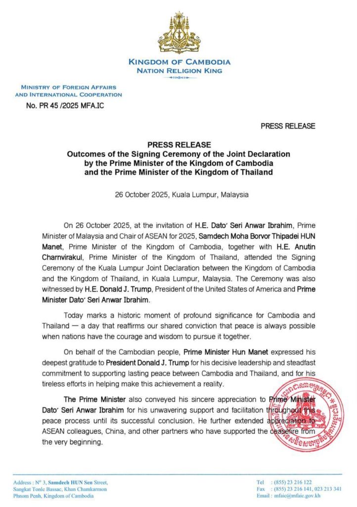 ដោយឡែកក្នុងសេចក្តីប្រកាសព័ត៌មានរបស់ក្រសួងការបរទេស និងសហប្រតិបត្តិការអន្តរជាតិបានបញ្ជាក់ថា ថ្ងៃនេះត្រូវបានកត់ត្រាជាព្រឹត្តិការណ៍ប្រវត្តិសាស្ត្រដ៏មានសារៈសំខាន់ជាសារវ័ន្ត សម្រាប់កម្ពុជា និងថៃ ដែលបានបញ្ជាក់ឡើងវិញនូវការជឿជាក់រួមគ្នានៃប្រទេសយើងទាំងពីរថា សន្តិភាពនៅតែអាចមាន ដរាបណាប្រជាជាតិនានាមានសេចក្តីក្លាហាន និងសុភវិនិច្ឆ័យក្នុងការបន្តស្វែងរកសន្តិភាពជាមួយគ្នា។