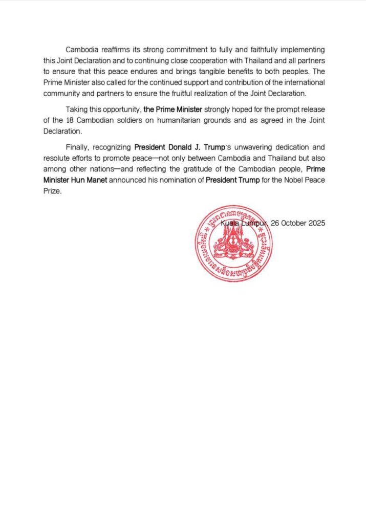 ជាចុងក្រោយ ដោយទទួលស្គាល់ការលះបង់ដ៏ធំធេង និងកិច្ចខិតខំប្រឹងប្រែងយ៉ាងម៉ឺងម៉ាត់ របស់ឯកឧត្តមប្រធានាធិបតី Donald J. Trump ក្នុងការលើកកម្ពស់សន្តិភាព មិនត្រឹមតែរវាងកម្ពុជា និងថៃប៉ុណ្ណោះទេ ថែមទាំងក្នុងចំណោមប្រជាជាតិទាំងឡាយ និងដើម្បីបង្ហាញនូវការដឹងគុណរបស់ ប្រជាជនកម្ពុជា សម្តេចនាយករដ្ឋមន្ត្រី ហ៊ុន ម៉ាណែត បានប្រកាសស្នើបេក្ខភាពឯកឧត្តមប្រធានាធិបតី Trump សម្រាប់ពានរង្វាន់ណូបែលសន្តិភាព ៕