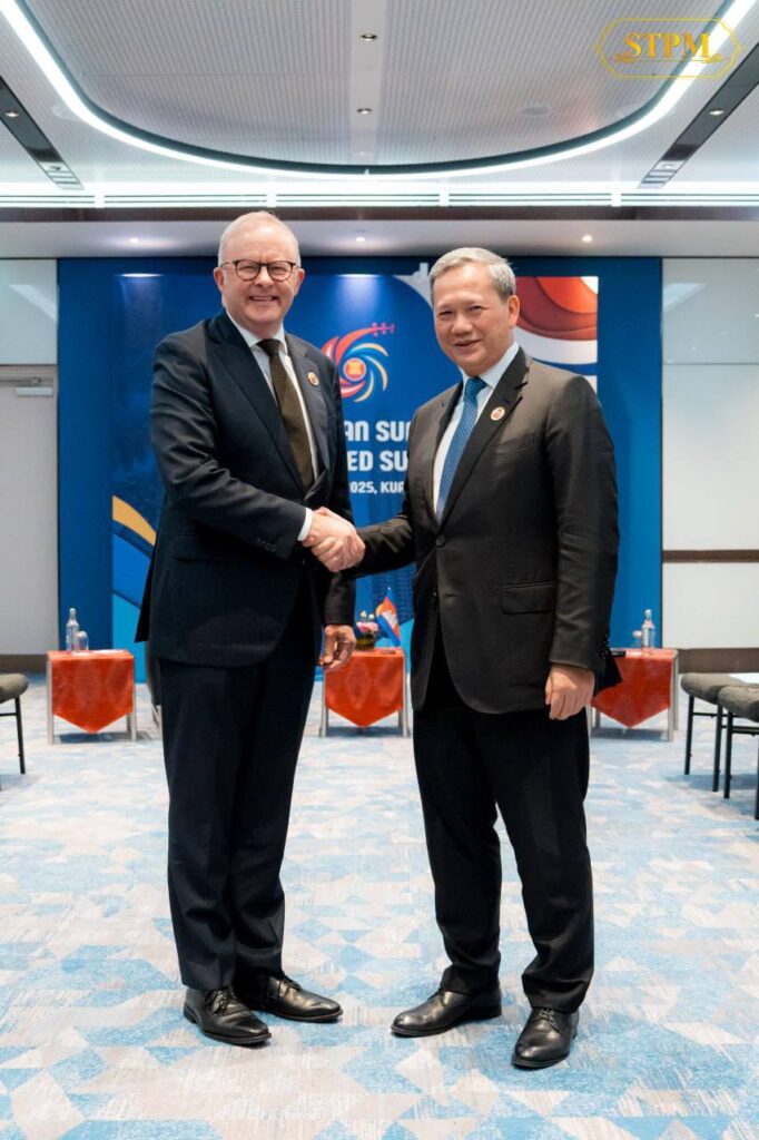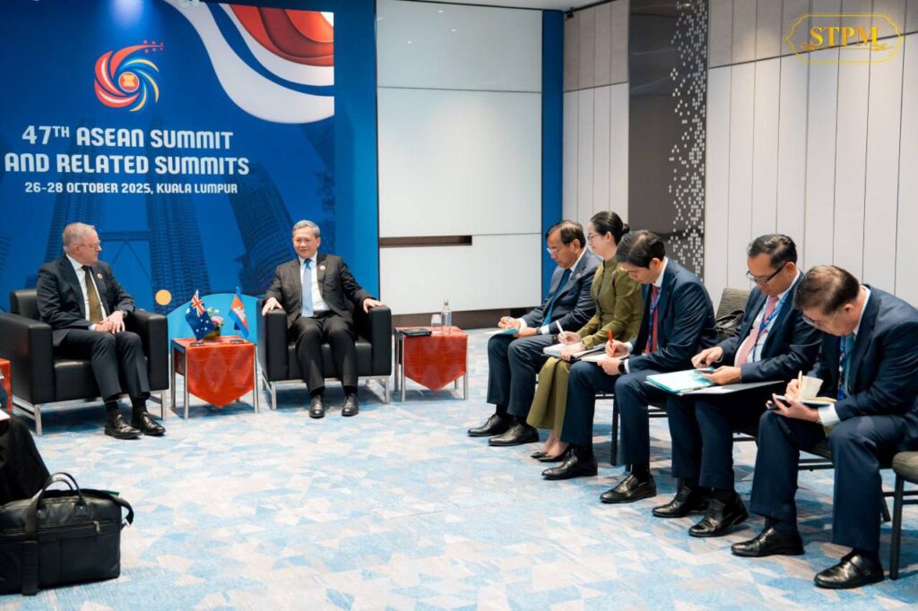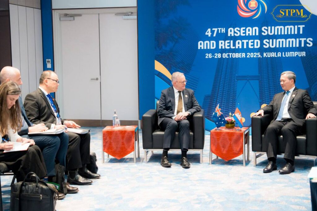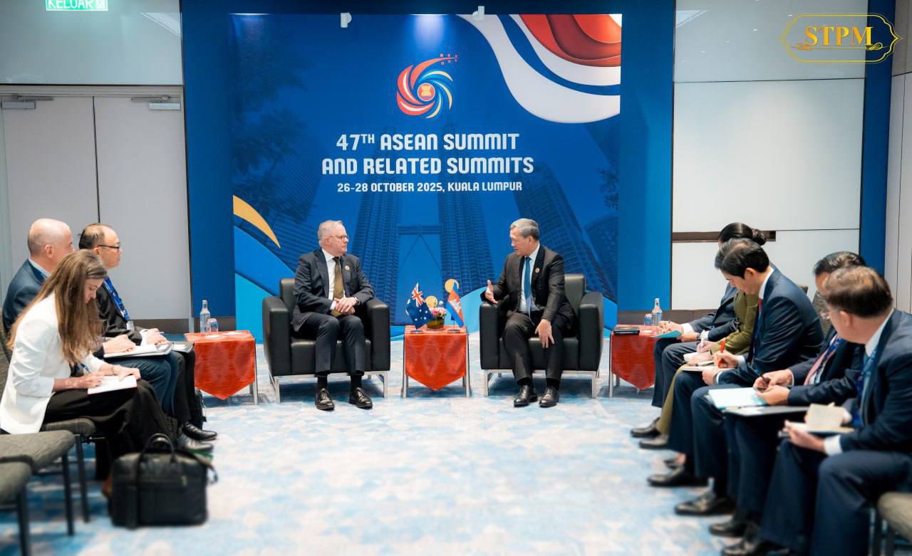 (គូឡាឡាំពួ)៖ សម្តេចមហាបវរធិបតី ហ៊ុន ម៉ាណែត នាយករដ្ឋមន្រ្តី នៃព្រះរាជាណាចក្រកម្ពុជា និង ឯកឧត្តម Anthony Albanese នាយករដ្ឋមន្ត្រីអូស្ត្រាលី បានជួបពិភាក្សាការងារទ្វេភាគី នារសៀល ថ្ងៃទី២៧ ខែតុលា ឆ្នាំ២០២៥ ក្នុងឱកាសចូលរួមកិច្ចប្រជុំកំពូលអាស៊ាន លើកទី៤៧ និងកិច្ចប្រជុំកំពូលពាក់ព័ន្ធ នៅទីក្រុងគូឡាឡាំពួ ប្រទេសម៉ាឡេស៊ី នៅថ្ងៃទី២៦-២៨ ខែតុលា ឆ្នាំ២០២៥។