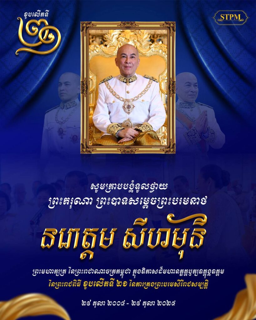 (ភ្នំពេញ)៖ ថ្ងៃទី២៩ ខែតុលា ឆ្នាំ២០២៥ គឺជាព្រះរាជពិធីបុណ្យខួបលើកទី២១ នៃការយាងគ្រងព្រះបរមសិរីរាជសម្បត្តិរបស់ព្រះករុណា ព្រះបាទ សម្តេច ព្រះបរមនាថ នរោត្តម សីហមុនី ព្រះមហាក្សត្រ នៃព្រះរាជាណាចក្រកម្ពុជា (២៩ ខែតុលា ឆ្នាំ២០០៤ – ២៩ ខែតុលា ឆ្នាំ២០២៥) ។