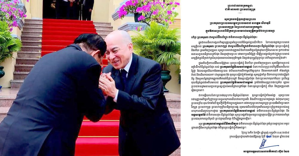 សារលិខិតរបស់សម្តេចតេជោ ហ៊ុន សែន ប្រធានព្រឹទ្ធសភានៃកម្ពុជា មានខ្លឹមសារថា៖ ព្រះករុណាជាអម្ចាស់ជីវិតលើត្បូង បាននិងកំពុងបំពេញព្រះរាជសកម្មភាពដ៏មហាមង្គលថ្លៃថ្លាគ្មានអ្វីផ្ទឹមពុំបាន មិនខ្លាចនឿយព្រះកាយពល បន្តព្រះរាជបូជនីយកិច្ចនៃ សម្តេចព្រះបរមរតនកោដ្ឋ និងគង់ជាម្លប់ដ៏ត្រជាក់ត្រជំថ្កើងថ្កាន ដើម្បីប្រជាជាតិ មានសុខសន្តិភាព ឯករាជ្យភាព អធិបតេយ្យភាពជាតិ បូរណភាពទឹកដី និងប្រជា រាស្ត្ររួមរស់ជាមហាគ្រួសារតែមួយ ប្រកបដោយសុខដុមរមនា សុភមង្គល និងវិបុលភាព ក្រោមបាវនា ជាតិ សាសនា ព្រះមហាក្សត្រ ជាពិសេស នាំមកនូវមោទនភាព និងកិត្យានុភាពជាតិកាន់តែខ្ពង់ខ្ពស់ថែមទៀត ទាំងក្នុងក្របខ័ណ្ឌតំបន់ និងពិភពលោក ។