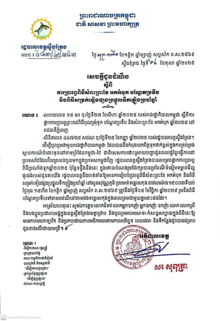 រដ្ឋបាលខេត្តស្ទឹងត្រែងបានបញ្ជាក់ក្នុងសេចក្តីជូនដំណឹងថា រដ្ឋបាលខេត្តស្ទឹងត្រែងបានសម្រេចផ្អាការប្រារព្ធពិធីប្រណាំងទូកឆ្នាំ២០២៥។ប៉ុន្តែទន្ទឹមនឹងនេះក្នុងគោលបំណង រួមថែរក្សាបាននូវប្រពៃណី ទំនៀមទម្លាប់ដ៏ល្អផូរផង់របស់ដូនតាយើង រដ្ឋបាលខេត្តនឹងចាត់តាំងឲ្យមានការរៀបចំប្រារព្ធពិធី «សំពះព្រះខែ អកអំបុក បណ្តែតប្រទីប និងពិធីសម្រក់ទៀនផ្សងប្រផ្នូលទឹកភ្លៀង ប្រចាំឆ្នាំថ្មី២០២៦» ដែលមានការចូលរួមពីរដ្ឋបាលក្រុង-ស្រុកទាំង៦ នៃខេត្តស្ទឹងត្រែង នៅលើសួនសុវណ្ណភូមិ ប្របនឹងមាត់ទន្លេសេកុងស្ទឹងត្រែង នាវេលាម៉ោង ៧យប់ ថ្ងៃពុធ ១៥កើត «ពេញបូណ៌មី» ខែកក្តិក ឆ្នាំម្សាញ់ សប្តស័ក ព.ស ២៥៦៩ ត្រូវនឹងថ្ងៃទី៥ ខែវិច្ឆិកា ឆ្នាំ២០២៥។ នៅក្នុងរាត្រី ១៥កើតនោះផងទៀត រដ្ឋបាលខេត្ត ក៏នឹងរៀបចំពិធីបណ្តែតប្រទីបទៅតាមបវេណី នៅតាមដងទន្លេសេកុង ក្នុងពេលព្រមជាមួយគ្នានោះ ផងដែរ។