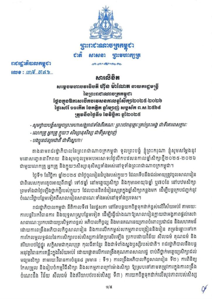 (ភ្នំពេញ)៖ រាជរដ្ឋាភិបាលកម្ពុជា នីតិកាលទី៧ នៃរដ្ឋសភា នៅតែបន្តយកចិត្តទុកដាក់ខ្ពស់លើវិស័យអប់រំ តាមរយៈ ការបន្តរិះរកវិធានការ និងយុទ្ធសាស្ត្របន្ថែមទៀត ដើម្បីធ្វើយ៉ាងណាឱ្យសាលារៀនក្លាយជាអង្គភាពផ្តល់សេវា សាធារណៈប្រកបដោយប្រសិទ្ធភាពខ្ពស់ អភិបាលកិច្ចល្អ ។ នេះបើតាមសារលិខិតរបស់សម្តេចមហាបវរធិបតី ហ៊ុន ម៉ាណែត នាយករដ្ឋមន្ត្រី នៃព្រះរាជាណាចក្រកម្ពុជា ថ្លែងក្នុងឱកាសបើកបវេសនកាលឆ្នាំសិក្សា២០២៥-២០២៦ ថ្ងៃទី១ ខែវិច្ឆិកា ឆ្នាំ២០២៥ ។