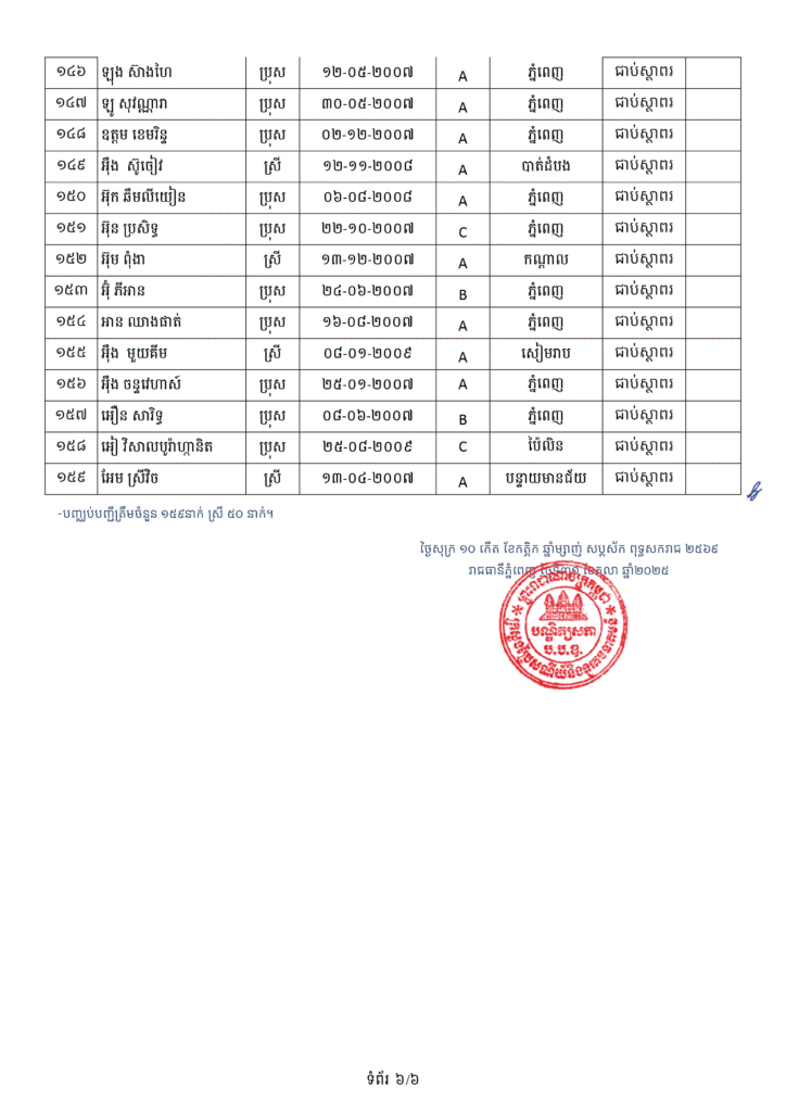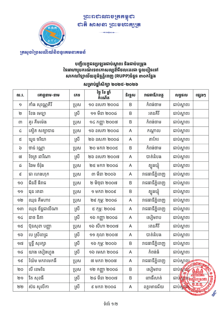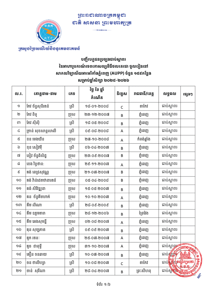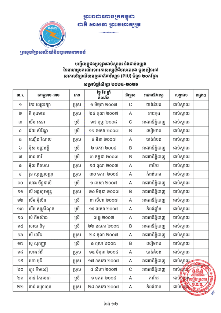លទ្ធផលការប្រឡងជ្រើសរើសនិស្សិតអាហារូបករណ៍ទេពកោសល្យឌីជីថលតេជោ សិក្សាថ្នាក់បរិញ្ញាបត្របច្ចេកវិទ្យាឌីជីថល សម្រាប់ឆ្នាំសិក្សា ២០២៥-២០២៦