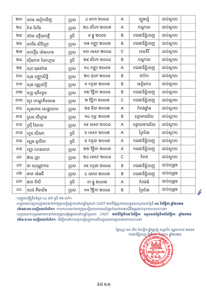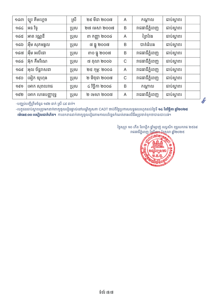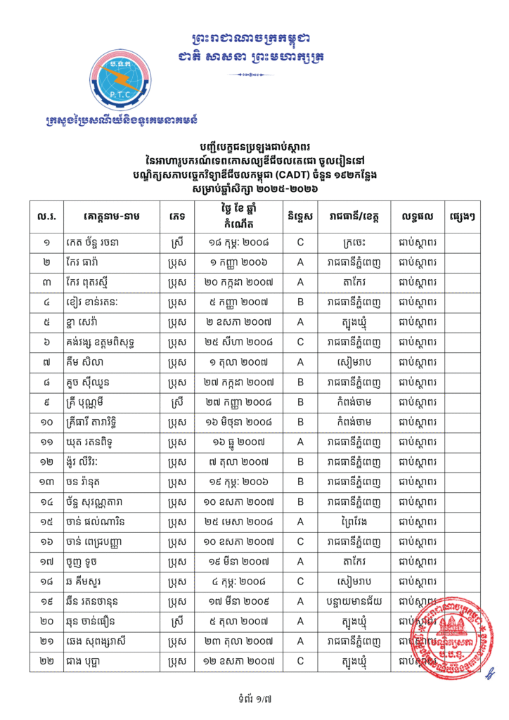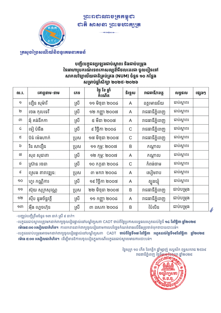 ក្រសួងប្រៃសណីយ៍និងទូរគមនាគមន៍ ប្រកាសលទ្ធផលការប្រឡងជ្រើសរើសនិស្សិតអាហារូបករណ៍ទេពកោសល្យឌីជីថលតេជោ សិក្សាថ្នាក់បរិញ្ញាបត្របច្ចេកវិទ្យាឌីជីថល សម្រាប់ឆ្នាំសិក្សា ២០២៥-២០២៦។ បេក្ខជនជាប់ជាស្ថាពរទាំងអស់ ដែលត្រូវសិក្សានៅបណ្ឌិត្យសភាបច្ចេកវិទ្យាឌីជីថលកម្ពុជា (CADT), សាកលវិទ្យាល័យភូមិន្ទភ្នំពេញ (RUPP), វិទ្យាស្ថានបច្ចេកវិទ្យាកម្ពុជា (ITC), សាកលវិទ្យាល័យជាតិគ្រប់គ្រង (NUM), និង សាកលវិទ្យាល័យអន្តរជាតិផារ៉ាហ្គន (Paragon.U) ត្រូវមកដាក់ពាក្យចូលរៀនផ្ទាល់នៅបណ្ឌិត្យសភាបច្ចេកវិទ្យាឌីជីថលកម្ពុជា (CADT) ចាប់ពីថ្ងៃប្រកាសលទ្ធផលរហូតដល់ថ្ងៃទី១៤ ខែវិច្ឆិកា ឆ្នាំ២០២៥ ម៉ោង៥:០០ នាទីរសៀលជាកំហិត។ ការខកខានដាក់ពាក្យចូលរៀនតាមកាលបរិច្ឆេទកំណត់ខាងលើនឹងត្រូវចាត់ទុកថាបានបោះបង់។
