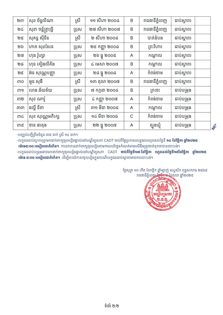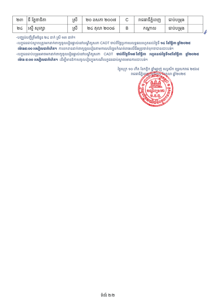 -បេក្ខជនជាប់បម្រុងទាំងអស់ RUPP NUM ITC និង Paragon.U អាចមកដាក់ពាក្យចូលរៀនផ្ទាល់នៅ CADT ចាប់ពីថ្ងៃទី១៧ ខែវិច្ឆិកា រហូតដល់ថ្ងៃទី១៩ ខែវិច្ឆិកា ឆ្នាំ២០២៥ ម៉ោង ៥:០០ នាទីរសៀលជាកំហិត ដើម្បីមានឱកាសចូលសិក្សាក្នុងករណីបេក្ខជនជាប់ស្ថាពរមានការបោះបង់។