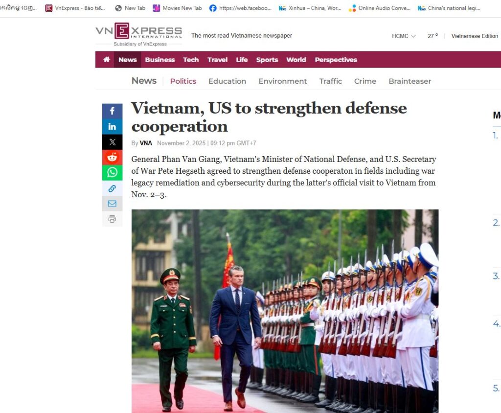 យោងតាមការចេញផ្សាយ របស់ទីភ្នាក់ងារព័ត៌មាន VNexpress, រដ្ឋមន្ត្រីក្រសួងការពារជាតិអាមេរិក លោក Pete Hegseth និងលោក Phan Van Giang រដ្ឋមន្ត្រីក្រសួងការពារជាតិវៀតណាម បានព្រមព្រៀងពង្រឹងកិច្ចសហប្រតិបត្តិការ លើវិស័យការពារជាតិ រួមទាំង ការជួសជុលកេរ្តិ៍ដំណែលសង្រ្គាម និងសន្តិសុខ តាមអ៊ីនធឺណិត ក្នុងអំឡុងដំណើរទស្សនកិច្ចផ្លូវការ របស់លោក Pete Hegseth នៅវៀតណាម ចាប់ពីថ្ងៃទី២ ដល់ ទី៣ ខែវិច្ឆិកា។