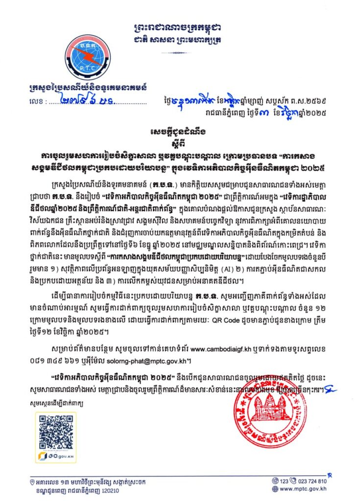 ភ្នំពេញ៖ ក្រសួងប្រៃសណីយ៍និងទូរគមនាគមន៍ (ក.ប.ទ.)ប្រកាសឱ្យដឹងថា នឹងរៀបចំ “វេទិកាអភិបាលកិច្ចអ៊ីនធឺណិតកម្ពុជា ២០២៥” ជាព្រឹត្តិការណ៍អមក្នុង “វេទិការដ្ឋាភិបាលឌីជីថលឆ្នាំ២០២៥ និងព្រឹត្តិការណ៍ជាតិ-អន្តរជាតិពាក់ព័ន្ធ” ដែលនឹងប្រព្រឹត្តទៅនៅថ្ងៃទី៦ ខែធ្នូ ឆ្នាំ២០២៥ នៅមជ្ឈមណ្ឌលសន្និបាតនិងពិព័រណ៍កោះពេជ្រខាងមុខ។