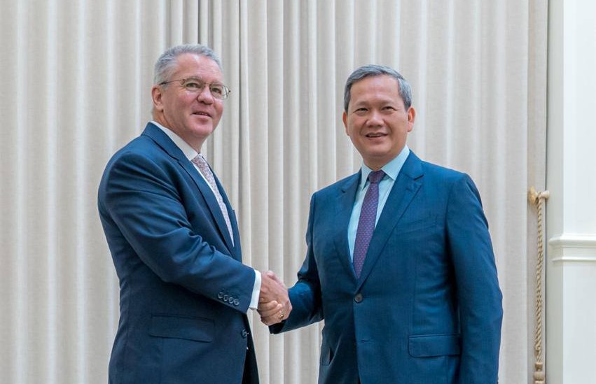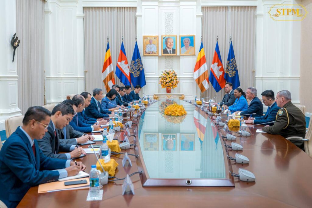 សម្តេចមហាបវរធិបតី ហ៊ុន ម៉ាណែត នាយករដ្ឋមន្ត្រី នៃព្រះរាជាណាចក្រកម្ពុជា បានអនុញ្ញាតឱ្យគណៈប្រតិភូសហរដ្ឋអាមេរិក ដែលដឹកនាំដោយ ឯកឧត្តម Michael George DeSombre ឧបការីរដ្ឋមន្ត្រីការបរទេសហរដ្ឋអាមេរិក ទទួលបន្ទុកតំបន់អាស៊ីបូព៌ា និងប៉ាស៊ីហ្វិក ចូលជួបសម្តែងការគួរសម និងពិភាក្សាការងារ នាព្រឹកថ្ងៃទី៤ ខែវិច្ឆិកា ឆ្នាំ២០២៥ នៅវិមានសន្តិភាព។