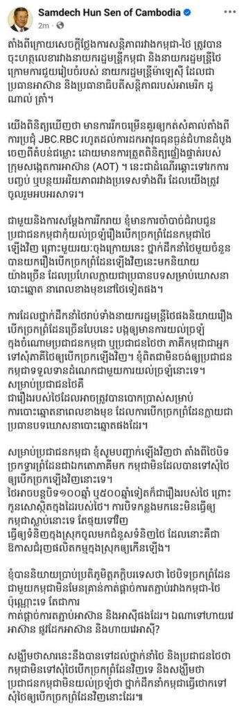 សម្តេចតេជោ ហ៊ុន សែន បានសរសេរនៅលើបណ្តាញសង្គម នៅយប់ថ្ងៃទី៤ ខែវិច្ឆិកា ឆ្នាំ២០២៥នេះថា តាំងពីក្រោយសេចក្តីថ្លែងការណ៍សន្កិភាពរវាងកម្ពុជា-ថៃ ត្រូវបានចុះហត្ថលេខារវាងនាយករដ្ឋមន្ត្រីកម្ពុជា និងនាយករដ្ឋមន្ត្រីថៃ ក្រោមការជួយរៀបចំរបស់នាយករដ្ឋមន្ត្រីម៉ាឡេស៊ី ដែលជាប្រធានអាស៊ាន និងប្រធានាធិបតីសន្តិភាពរបស់អាមេរិក ដូណាល់ ត្រាំ។ យើងពិនិត្យឃើញថា មានការរីកចម្រើនគួរឱ្យកត់សម្គាល់តាំងពីការប្រជុំ JBC.RBC រហូតដល់ការដកអាវុធធុនធ្ងន់ជំហានដំបូងចេញពីតំបន់ជម្លោះ ដោយមានការត្រួតពិនិត្យផ្ទៀងផ្ទាត់របស់ក្រុមសង្កេតការណ៍អាស៊ាន (AOT) ។ នេះជាដំណើរឆ្ពោះទៅរកការបញ្ចប់ ឬបន្ថយអរិយភាពរវាងប្រទេសទាំងពីរ ដែលយើងត្រូវចូលរួមអបអរសាទរ។
