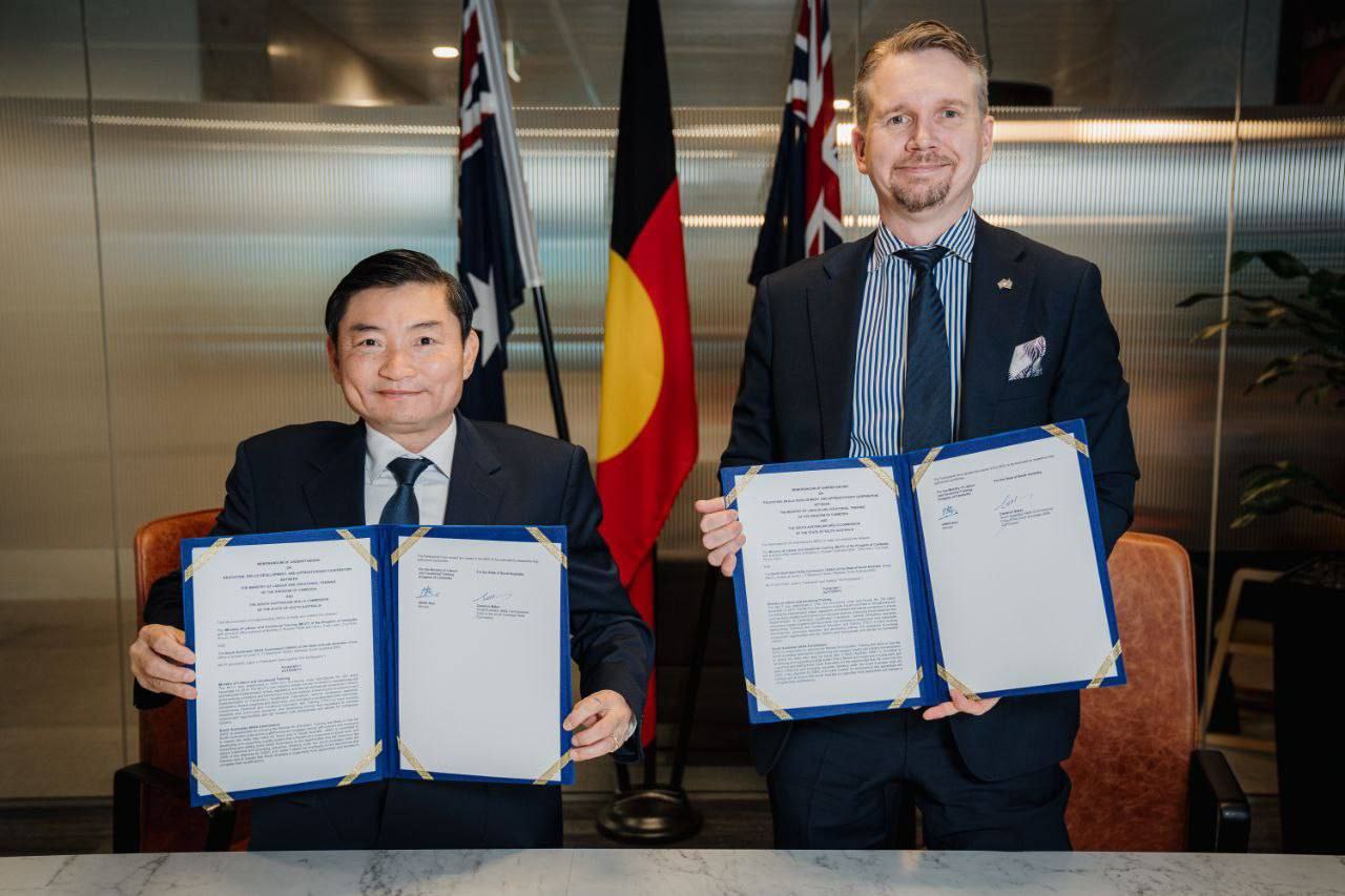 (អូស្ត្រាលី)៖ កាលពីថ្ងៃទី៤ ខែវិច្ឆិកា ឆ្នាំ២០២៥ ឯកឧត្តម ហេង សួរ រដ្ឋមន្ត្រីក្រសួងការងារ និងបណ្តុះបណ្តាលវិជ្ជាជីវៈ និងលោក Cameron Baker ប្រធានស្នងការជំនាញ នៃរដ្ឋអូស្ត្រាលីខាងត្បូង (South Australian Skills Commission) បានរួមគ្នាចុះហត្ថលេខា លើកិច្ចព្រមព្រៀងសហប្រតិបត្តិការ ផ្នែកបណ្តុះបណ្តាលបច្ចេកទេស និងវិជ្ជាជីវៈ និងកម្មវិធីហាត់ការ ដែលអាចនឹងអនុញ្ញាតឱ្យសិស្សនិស្សិតកម្ពុជា ដែលកំពុងរៀនថ្នាក់សញ្ញាបត្របច្ចេកទេស និងវិជ្ជាជីវៈ ១-៣ ដែលចុះបញ្ជិកានៅក្រសួងការងារ និងបណ្តុះបណ្តាលវិជ្ជាជីវៈ និងទទួលស្គាល់ដោយស្នងការជំនាញអូស្ត្រាលី អាចទៅបន្តការសិក្សានៅគ្រឹះស្ថានបណ្តុះបណ្តាលជំនាញវិជ្ជាជីវៈ និងចុះហាត់ការផ្ទាល់រយៈពេល ២ឆ្នាំ នៅតាមរោងជាង ការដ្ឋាន និងកសិដ្ឋាននានា ក្នុងរដ្ឋអូស្ត្រាលីខាងត្បូង នៃប្រទេសអូស្ត្រាលី។
