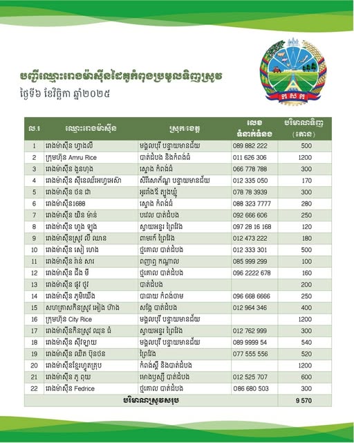 ភ្នំពេញ៖បរិមាណស្រូវសើមចំនួនជិតមួយម៉ឺនតោនត្រូវបានរោងម៉ាស៊ីន ដៃគូជាមួយក្រសួងកសិកម្ម សម្រុកប្រមូលទិញពីប្រជាកសិករនៅទូទាំងប្រទេសក្នុងថ្ងៃទី៦ ខែវិច្ឆិកា ឆ្នាំ២០២៥។នេះបើយោងតាមការបញ្ជាក់លើបណ្ដាញសង្គមហ្វេសប៊ុកផ្លូវការក្រសួងកសិកម្ម រុក្ខាប្រមាញ់ និងនេសាទ ។