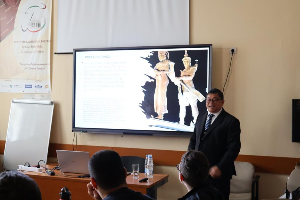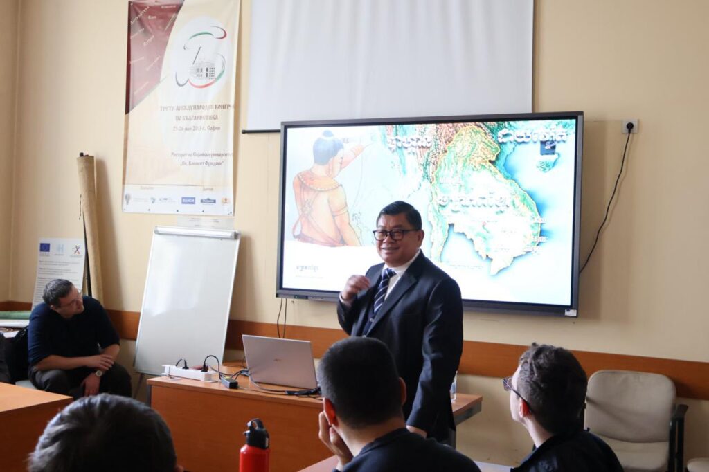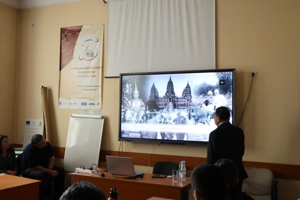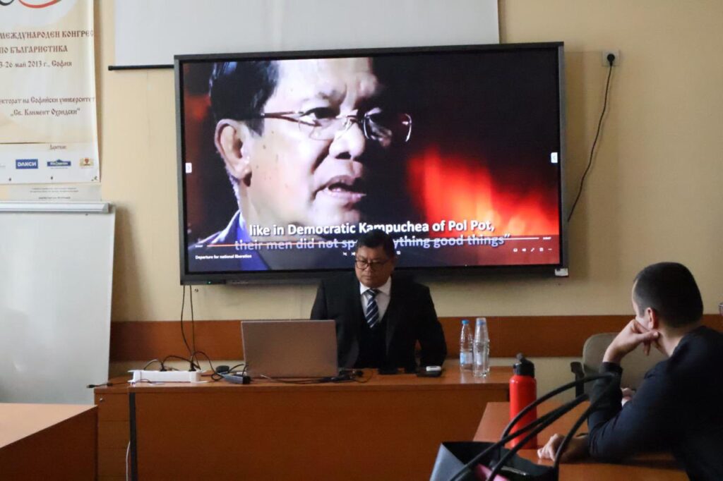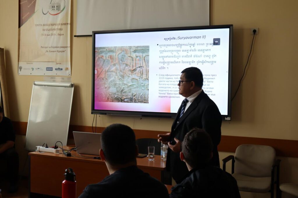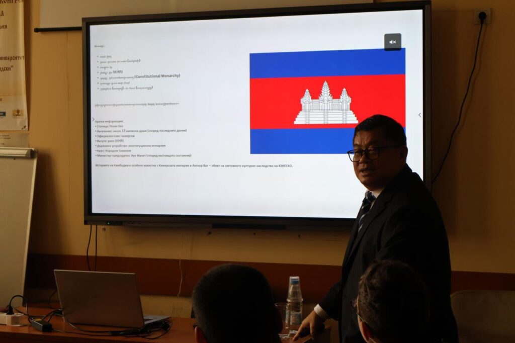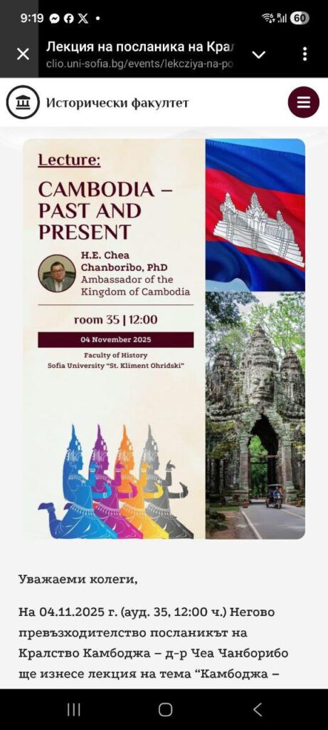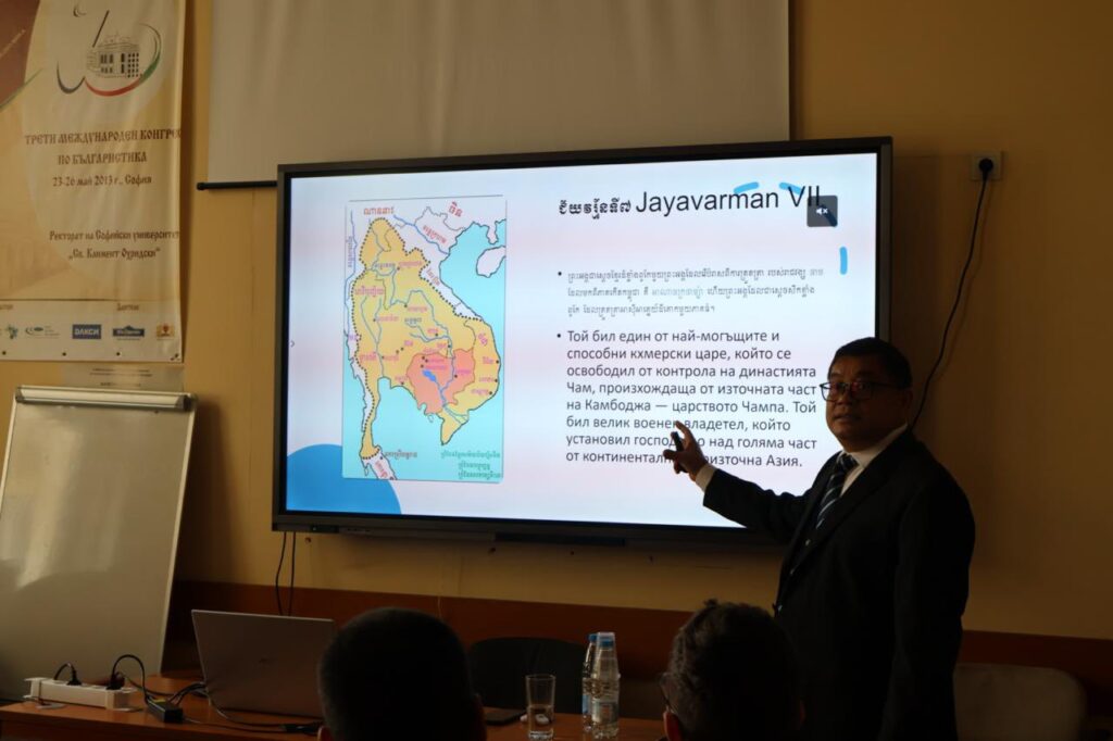 (ប៊ុលហ្គារី)៖ ឯកអគ្គរាជទូតខ្មែរ ប្រចាំនៅសាធារណរដ្ឋប៊ុលហ្គារី ឯកឧត្តមបណ្ឌិត ជា ច័ន្ទបរិបូណ៌ បានក្លាយជាសាស្ត្រាចារ្យកម្ពុជាដំបូងគេបង្អស់ ដែលបានធ្វើបទឧទ្ទេសនាម ដល់និស្សិតបរទេសពីប្រវត្តិនៃប្រទេសខ្មែរ នៅសាកលវិទ្យាល័យ សូហ្វៀ (Sofia University) ដែលជាស្ថាប័នអប់រំល្បីបំផុតមួយ នៅប្រទេសប៊ុលហ្គារី ។ ការធ្វើបទបង្ហាញ បានធ្វើឡើង នៅថ្ងៃទី០៤ ខែវិច្ឆិកា ឆ្នាំ២០២៥ ដែលនៅបន្ទាប់ពីថ្នាក់ដឹកនាំសាកលវិទ្យាល័យ បានអញ្ជើញ ឯកឧត្តមឯកអគ្គរាជទូត ជាផ្លូវការ ដើម្បីធ្វើបទបង្ហាញដល់និស្សិតនៃមហាវិទ្យាល័យប្រវត្តិសាស្ត្រ និងវិទ្យាសាស្ត្រនយោបាយ អំពីប្រវត្តិសាស្ត្រ និងដំណើរវិវត្តន៍នយោបាយរបស់កម្ពុជា ។
