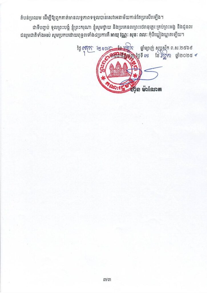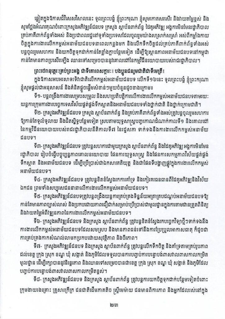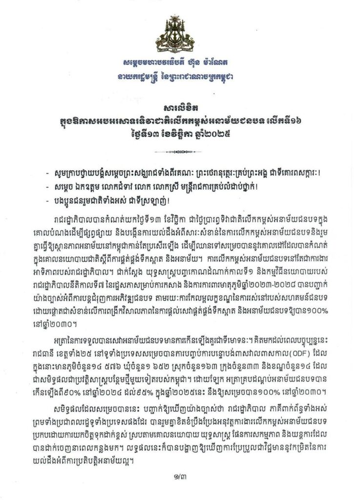 (ភ្នំពេញ)៖ សម្តេចមហាបវរធិបតី ហ៊ុន ម៉ាណែត នាយករដ្ឋមន្ត្រី នៃព្រះរាជាណាចក្រកម្ពុជា បានគូសបញ្ជាក់ថា ការលើកកម្ពស់អនាម័យជនបទ នៅតែជាការងារអាទិភាពរបស់រាជរដ្ឋាភិបាល ។ នេះបើតាមសារលិខិតរបស់សម្តេចធិបតី ហ៊ុន ម៉ាណែត ក្នុងឱកាសអបអរសាទរទិវាជាតិលើកកម្ពស់អនាម័យជនបទ លើកទី១៦ ថ្ងៃទី១៣ ខែវិច្ឆិកា ឆ្នាំ២០២៥ ។