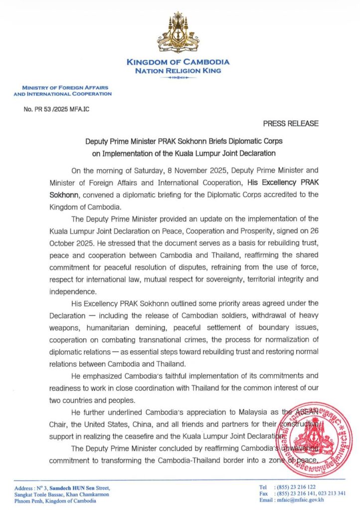 ឯកឧត្តមឧបនាយករដ្ឋមន្ត្រីបានជម្រាបជូនអំពីបច្ចុប្បន្នភាពនៃការអនុវត្តសេចក្តីថ្លែងការណ៍រួម ទីក្រុងគូឡាឡាំពួ ស្តីពីសន្តិភាព កិច្ចសហប្រតិបត្តិការ និងវិបុលភាព ដែលបានចុះហត្ថលេខានៅថ្ងៃទី ២៦ ខែតុលា ឆ្នាំ២០២៥ ។