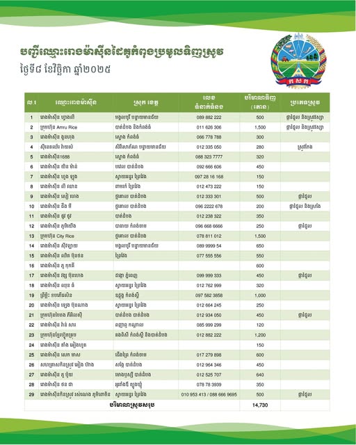 ភ្នំពេញ៖ស្រូវចំនួន១៤.០០០តោនបន្ថែមទៀតនឹងប្រមូលទិញដោយរោងម៉ាស៊ីនជាដៃគូក្រសួងកសិកម្ម រុក្ខាប្រមាញ់ និងនេសាទនៅថ្ងៃទី៩ ខែវិច្ឆិកា ឆ្នាំ២០២៥នេះ បន្ទាប់ពីមានទិញជិតមួយម៉ឺនតោនរួចមកហើយកាលពីថ្ងៃទី៧ ខែវិច្ឆិកា។