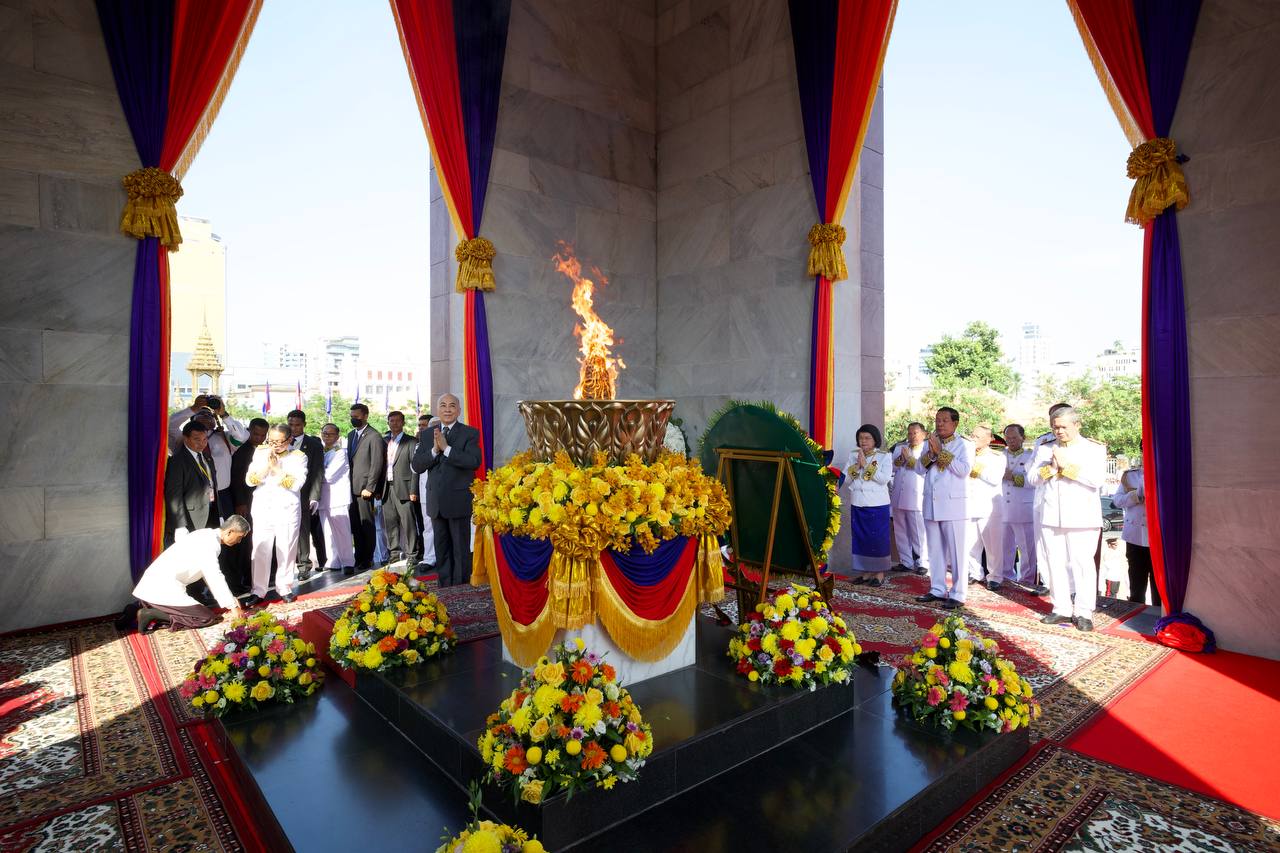 ក្នុងព្រះរាជពិធីនេះដែរ ព្រះករុណា ព្រះមហាក្សត្រ បានស្តេចយាងដាក់កម្រងផ្កា គោរពព្រះវិញ្ញាណក្ខន្ធវីរយុទ្ធជន យុទ្ធនារីខ្មែរ ដែលបានតស៊ូ និងធ្វើពលីកម្ម ក្នុងការទាមទារឯករាជ្យជាតិ បន្ទាប់មកព្រះអង្គបានយាងប្រោសប្រទានភ្លើងជ័យ។