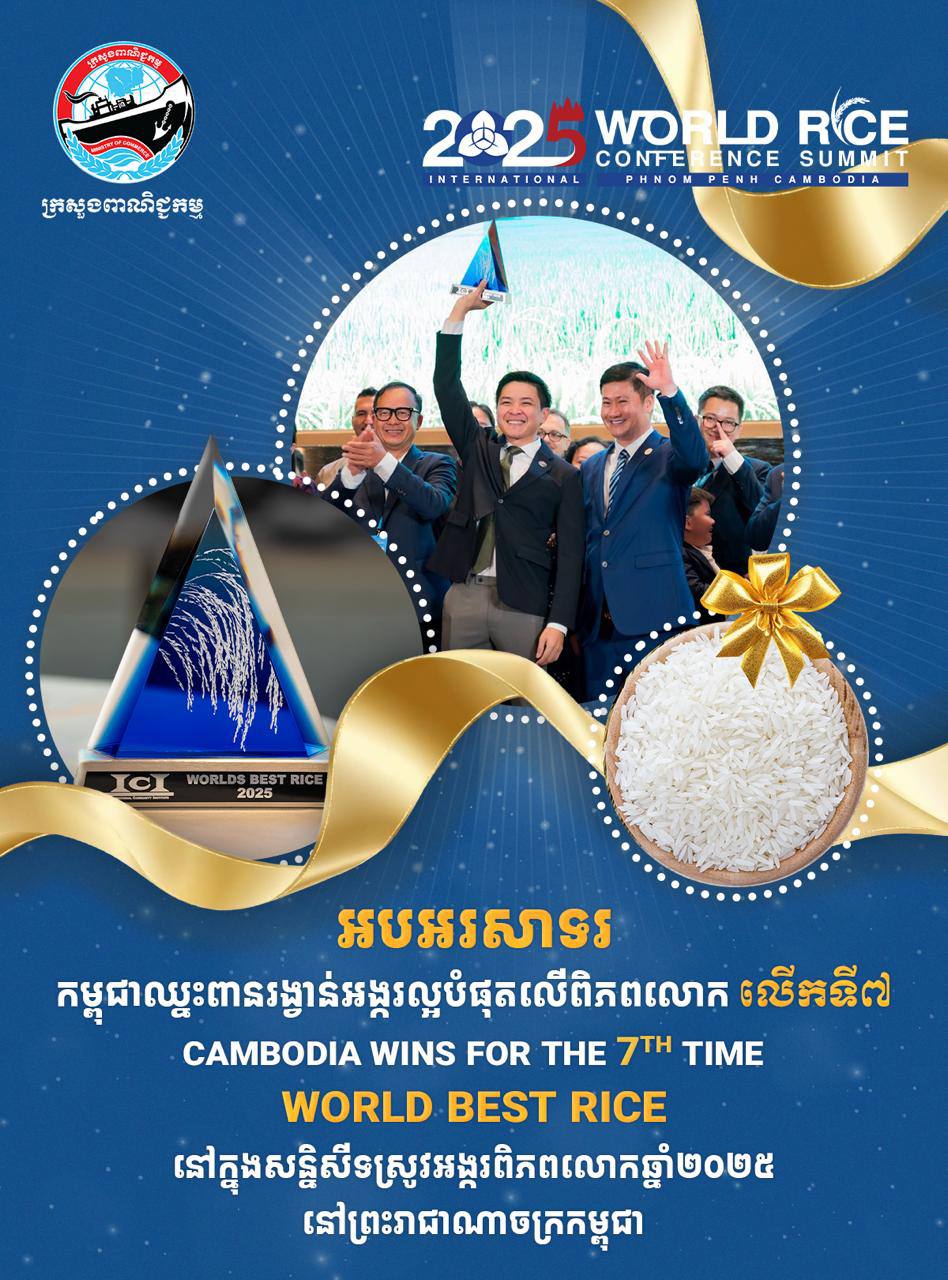 ភ្នំពេញ: កម្ពុជាបានឈ្នះពានរង្វាន់អង្ករល្អបំផុតលើពិភពលោកលើកទី ៧ ។ការឈ្នះពានរង្វាន់អង្ករល្អបំផុតក្នុងពិភពលោក (Worlds Best Rice 2025) នៅក្នុងសន្និសីទស្រូវអង្ករពិភពលោក ឆ្នាំ២០២៥ ដែលរៀបចំដោយ The Rice Trader រយៈពេល៣ថ្ងៃចាប់ពីថ្ងៃទី៧-៩ ខែវិច្ឆិកា ឆ្នាំ២០២៥ នៅរាជធានីភ្នំពេញ ព្រះរាជាណាចក្រកម្ពុជា ។