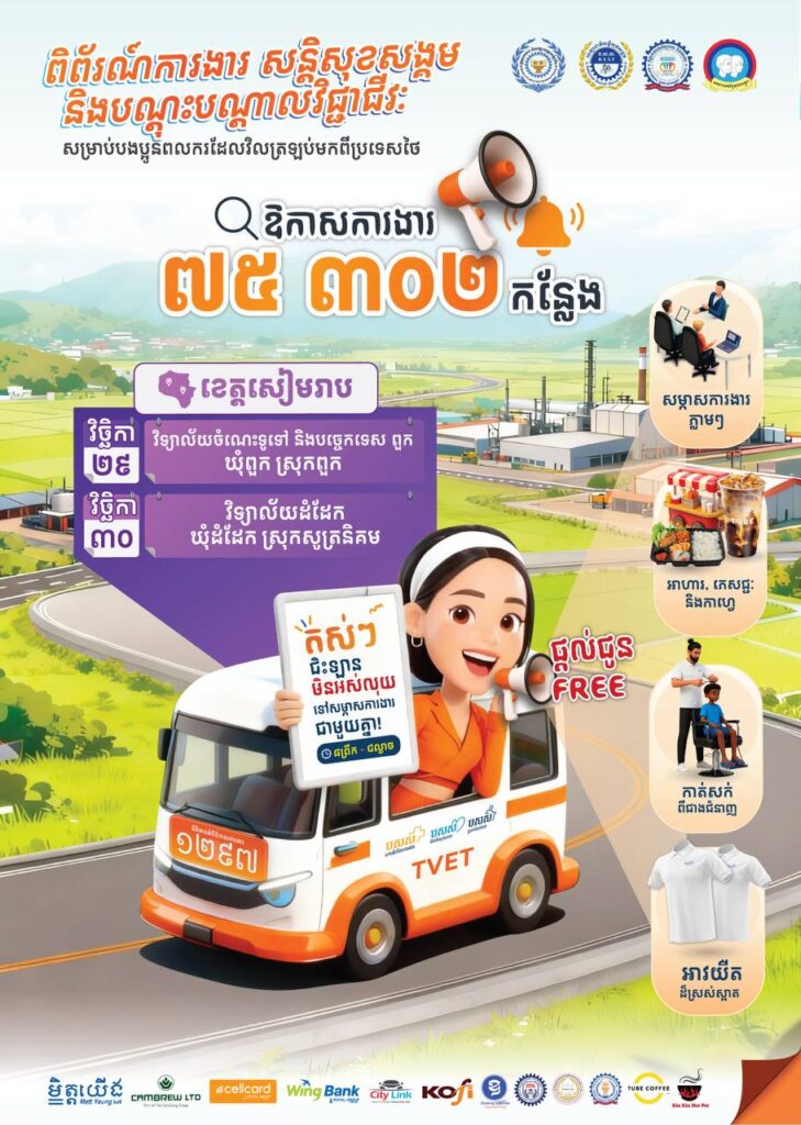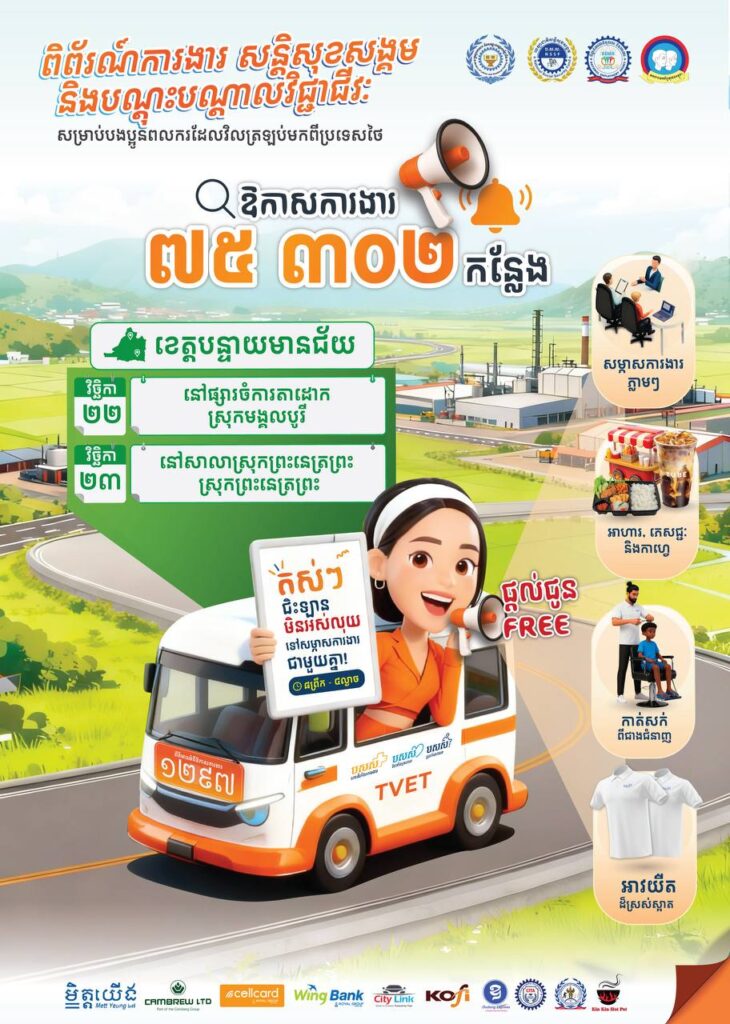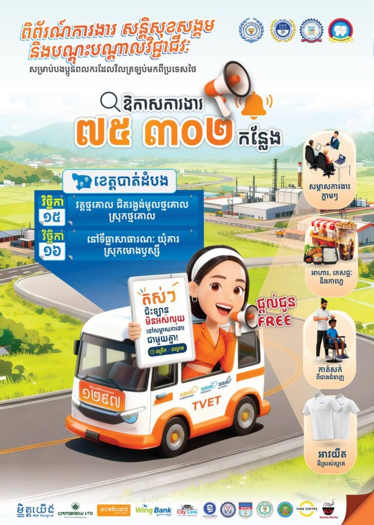 (ភ្នំពេញ)៖ ក្រសួងការងារ និងបណ្តុះបណ្តាលវិជ្ជាជីវៈ នឹងរៀបចំពិព័រណ៍ការងារ សន្តិសុខសង្គម និងបណ្តុះបណ្តាលវិជ្ជាជីវៈ នៅខេត្តធំៗចំនួន ៣គឺខេត្តបាត់ដំបង ខេត្តសៀមរាប និងខេត្តបន្ទាយមានជ័យ ដើម្បីផ្តល់ឱកាសការងារជូនប្រជាពលរដ្ឋ ជាពិសេស អតីតពលករដែលត្រឡប់មកពីប្រទេសថៃ។
