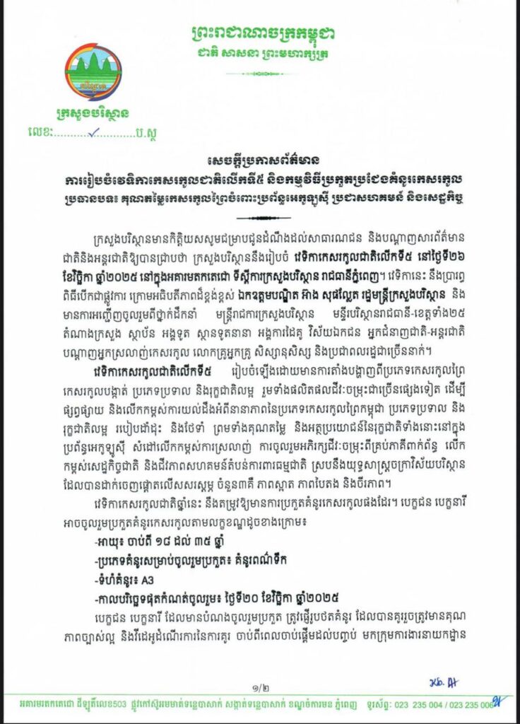 (ភ្នំពេញ)៖ ក្រសួងបរិស្ថាននឹង និងរៀបចំវេទិកាកេសរកូលជាតិលើកទី៥ និងកម្មវិធីប្រគួតប្រជែងគំនូរកេសរកូល ប្រធានបទ៖ គុណតម្លៃកេសរកូលព្រៃចំពោះប្រព័ន្ធអេកូឡូស៊ី ប្រជាសហគមន៍នៅថ្ងៃទី២៦ ខែវិច្ឆិកា ឆ្នាំ២០២៥ នៅក្នុងអគារមតកតេជោ ទីស្តីការក្រសួងបរិស្ថាន រាជធានីភ្នំពេញ ។