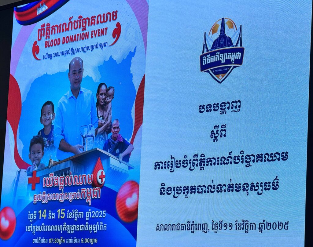 ព្រឹត្តិការណ៍បរិច្ចាគឈាមនេះ រៀបចំឡើងដោយក្រុមការងារពិធីករកីឡាកម្ពុជា សហការជាមួយក្រសួងសុខាភិបាល មជ្ឈមណ្ឌលជាតិផ្តល់ឈាម កាកបាទក្រហមកម្ពុជា សហភាពសហព័ន្ធយុវជនកម្ពុជា រដ្ឋបាលរាជធានីភ្នំពេញ និងក្រុមហ៊ុន Idea Factory ក្រោមមូលបទ«យើងផ្តល់ឈាម ផ្តល់ក្តីស្រឡាញ់សម្រាប់កម្ពុជា» ក្រោមការចង្អុលបង្ហាញណែនាំ និងគាំទ្រដ៏ខ្ពង់ខ្ពស់ពីសម្តេចអគ្គមហាសេនាបតីតេជោ ហ៊ុន សែន ប្រធានព្រឹទ្ធសភា នៃព្រះរាជាណាចក្រកម្ពុជា ក្នុងគោលបំណងក្នុងការលើកកម្ពស់ការយល់ដឹងអំពីការថែទាំសុខភាព និងអត្ថប្រយោជន៍នៃការបរិច្ចាគឈាម ព្រមទាំងជំរុញការផ្សព្វផ្សាយការបរិច្ចាគឈាមឲ្យបានជាង៣០០០ប្លោក ដើម្បីបំពេញតម្រូវការនៃការប្រើប្រាស់ឈាមក្នុងវិស័យសុខាភិបាល និងដល់សហគមន៍មូលដ្ឋានផងដែរ។ សូមជម្រាបជូនសាធារណៈជនឲ្យបានដឹងថា ព្រឹត្តិការណ៍បរិច្ចាគឈាម នឹងប្រព្រឹត្តទៅនៅថ្ងៃទី១៤-១៥ ខែវិច្ឆិកា ឆ្នាំ២០២៥ ខាងមុខនេះ។ ក្រៅពីនេះក៏មានការប្រកួតបាល់ទាត់មិត្តភាពនៅពេលរសៀល ថ្ងៃទី១៥ ខែវិច្ឆិកា ឆ្នាំ២០២៥៕