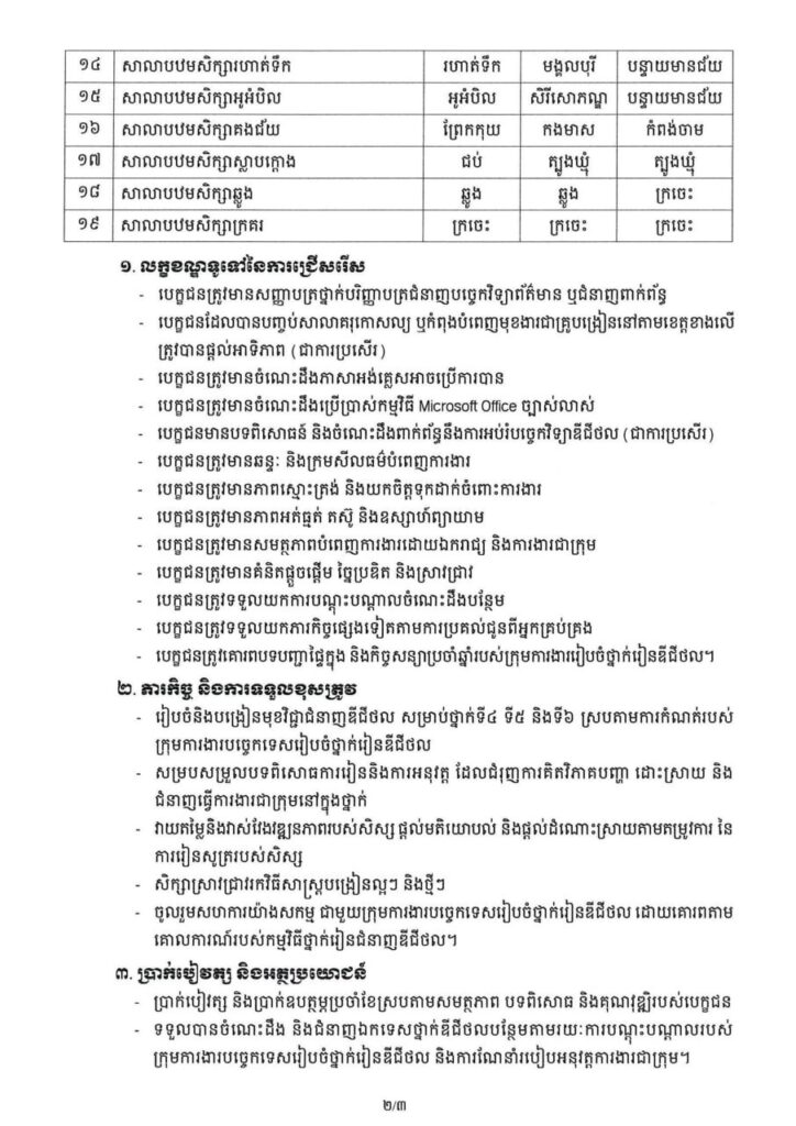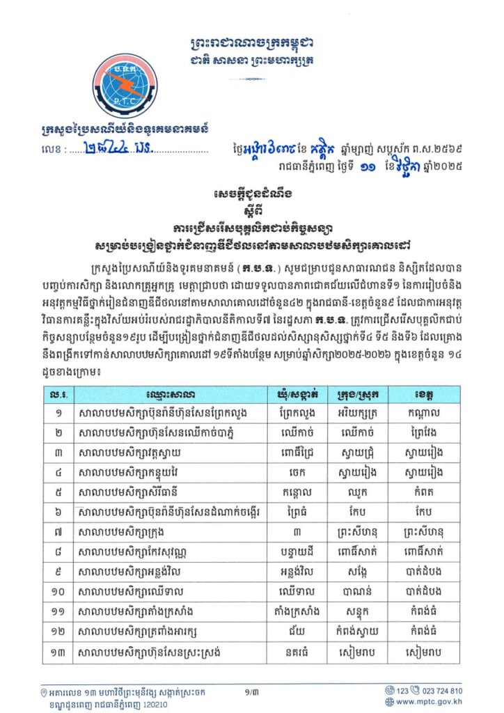 (ភ្នំពេញ)៖ ក្រសួងប្រៃសណីយ៍និងទូរគមនាគមន៍ (ក.ប.ទ.) សូមជម្រាបជូនសាធារណជន និស្សិតដែលបានបញ្ចប់ការសិក្សា និងលោកគ្រូអ្នកគ្រូ មេត្តាជ្រាបថា ដោយទទួលបានភាពជោគជ័យលើជំហានទី១ នៃការរៀបចំនិងអនុវត្តកម្មវិធីថ្នាក់រៀនជំនាញឌីជីថលនៅតាមសាលាគោលដៅចំនួន៤២ ក្នុងរាជធានី-ខេត្តចំនួន៩ ដែលជាការអនុវត្តវិធានការគន្លឹះក្នុងវិស័យអប់រំរបស់រាជរដ្ឋាភិបាលនីតិកាលទី៧ នៃរដ្ឋសភា ក.ប.ទ. ត្រូវការជ្រើសរើសបុគ្គលិកជាប់កិច្ចសន្យាបន្ថែមចំនួន១៩រូប ដើម្បីបង្រៀនថ្នាក់ជំនាញឌីជីថលដល់សិស្សានុសិស្សថ្នាក់ទី៤ ទី៥ និងទី៦ ដែលគ្រោងនឹងពង្រីកទៅកាន់សាលាបឋមសិក្សាគោលដៅ ១៩ទីតាំងបន្ថែម សម្រាប់ឆ្នាំសិក្សា២០២៥-២០២៦ ក្នុងខេត្តចំនួន ១៤។