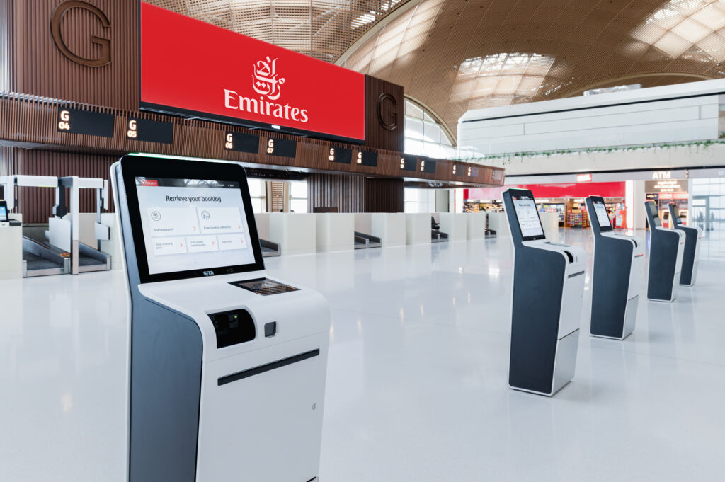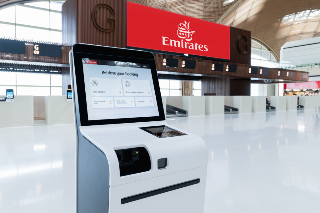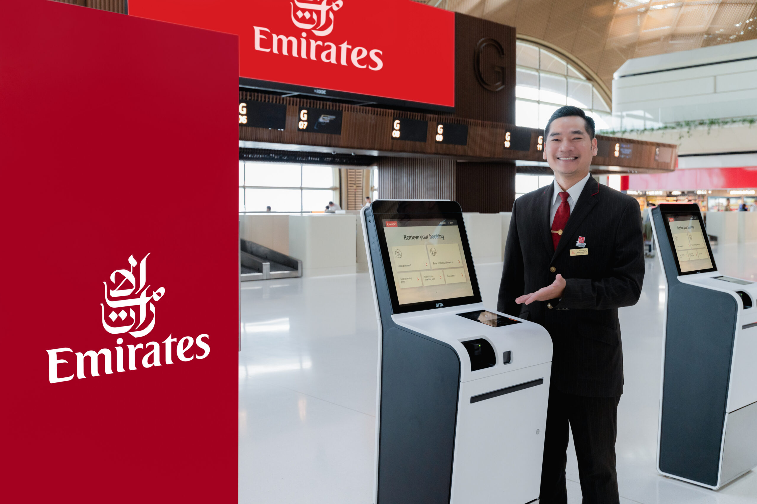 ម៉ាស៊ីនផ្ដល់សេវាកម្ម Check-in ដោយខ្លួនឯងចំនួនបួន ដែលភ្ជាប់ជាមួយប្រព័ន្ធរបស់ក្រុមហ៊ុនអាកាសចរណ៍ Emirates ត្រូវបានដាក់ឱ្យអតិថិជនរបស់ក្រុមហ៊ុនប្រើប្រាស់។ អតិថិជនអាចស្កេនលិខិតឆ្លងដែន ពិនិត្យ និងលក្ខខណ្ឌ ជ្រើសរើសឬផ្លាស់ប្តូរកៅអី ទិញសេវាកម្មបន្ថែម និងធ្វើបច្ចុប្បន្នភាពព័ត៌មានសម្រាប់ការទំនាក់ទំនង មុនពេលធ្វើដំណើរទៅកាន់កន្លែង check-in របស់ក្រុមហ៊ុនអាកាសចរណ៍ Emirates ដើម្បីដាក់អីវ៉ាន់របស់ខ្លួន។