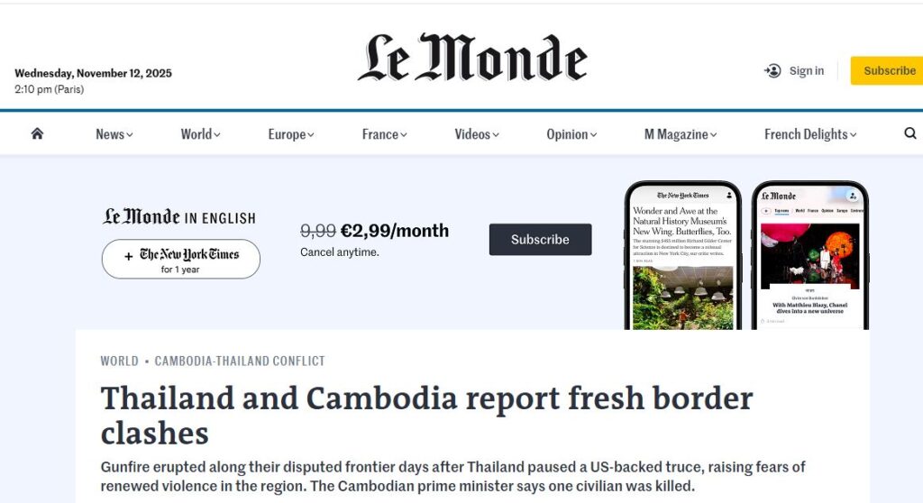 ភ្នំពេញ ៖ បណ្តាសារព័ត៌មានអន្តរជាតិល្បីៗចុះផ្សាយពីទាហានថៃសម្លាប់ពលរដ្ឋស៊ីវិលស្លូតត្រង់កម្ពុជា។