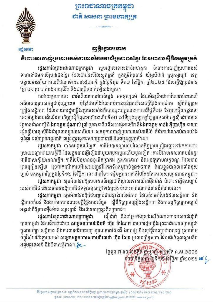 ក្នុងញ្ញតិថ្កោលទោសនារាត្រីថ្ងៃទី១២ ខែវិច្ឆិកា ឆ្នាំ២០២៥ រដ្ឋសភាកម្ពុជាបានហៅការវាយប្រហារនេះ ជាអំពើឃោរឃៅយង់ឃ្នង អមនុស្សធម៌ ដែលមិនត្រឹមជាការំលោភបំពានលើ អធិបតេយ្យរបស់កម្ពុជាប៉ុណ្ណោះទេ ប៉ុន្តែថែមទាំងរំលោភបំពានធ្ងន់ធ្ងរលើសេចក្តីថ្លែងការណ៍រួមស្តីពីកិច្ចព្រមព្រៀងសន្តិភាព ដែលនាយករដ្ឋមន្ត្រីនៃប្រទេសទាំងពីរបានចុះហត្ថលេខាកាលពីថ្ងៃទី២៦ ខែតុលាថ្មីៗកន្លងទៅនេះអំឡុងពេលដំណើរការកិច្ចប្រជុំកំពូលអាស៊ានលើកទី៤៧ នៅទីក្រុងគូឡាឡាំពួ ប្រទេសម៉ាឡេស៊ី ដោយមានវត្តមានជាសាក្សី ពីឯកឧត្តម ដូណាល់ ត្រាំ ប្រធានាធិបតីសហរដ្ឋអាមេរិក និងឯកឧត្តម អាន់វ៉ា អ៊ីប្រាហ៊ីម នាយក រដ្ឋមន្ត្រីម៉ាឡេស៊ីនិងជាប្រធានប្តូរវេនអាស៊ាន។ សកម្មភាពបាញ់ប្រហាររបស់ភាគីថៃ ក៏ជាការរំលោភបំពានយ៉ាង ធ្ងន់ធ្ងរ ដល់ច្បាប់អន្តរជាតិ ធម្មនុញ្ញអង្គការសហប្រជាជាតិ និងធម្មនុញ្ញអាស៊ាន។