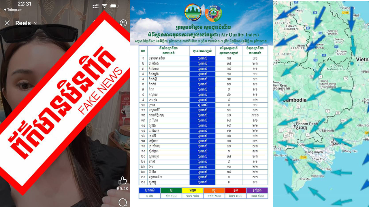 (ភ្នំពេញ)៖ ក្រសួងបរិស្ថានបានចេញសេចក្តីប្រកាសព័ត៌មានមួយដោយបញ្ជាក់ថាថ្ងៃទី១២ ខែវិច្ឆិកា ឆ្នាំ២០២៥ ក្រសួងបរិស្ថានបានកត់សម្គាល់ឃើញមានការផ្សព្វផ្សាយ និង ចែករំលែកនូវព័ត៌មានមិនពិត អំពីករណីគុណភាពខ្យល់នៅកម្ពុជា ធ្វើឱ្យមានការភាន់ច្រឡំថាហាក់បីដូចជា ប្រទេសកម្ពុជារងការបំពុលបរិយាកាស។ ក្រសួងបរិស្ថានស្នើឱ្យម្ចាស់ផេក Nimol Felix និងអ្នក ផ្សព្វផ្សាយបន្ត ធ្វើការលប់ព័ត៌មានមិនពិតនេះចេញ និងបញ្ឈប់ការផ្សព្វផ្សាយព័ត៌មាន ដែលជំរុញឱ្យ សាធារណជន មានការភាន់ច្រឡំ លើគុណភាពខ្យល់នៅកម្ពុជានាពេលបច្ចុប្បន្ន។