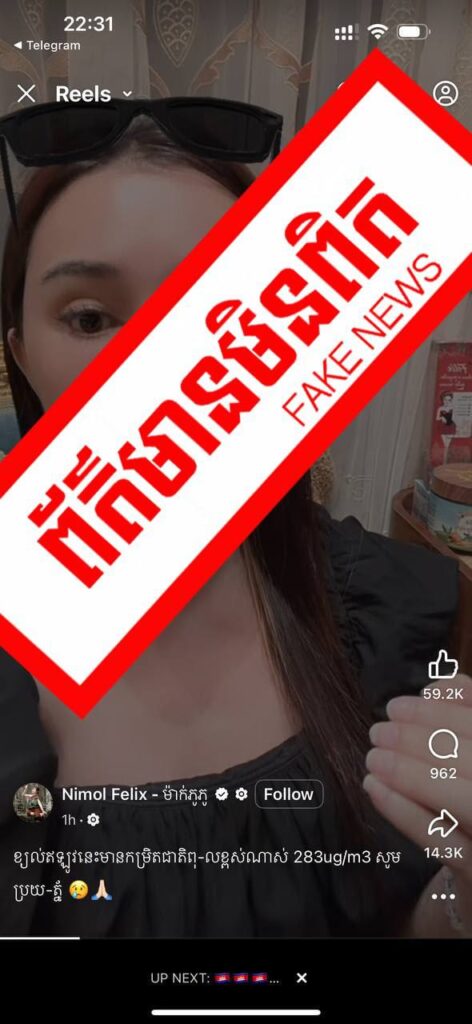 ក្រសួងបរិស្ថាន ប្រាប់ឱ្យម្ចាស់ផេក Nimol Felix និងអ្នកផ្សព្វផ្សាយបន្ត ធ្វើការលុបព័ត៌មានក្លែងក្លាយ ដែលភូតកុហកពីគុណភាពខ្យល់នៅកម្ពុជានោះចេញជាបន្ទាន់