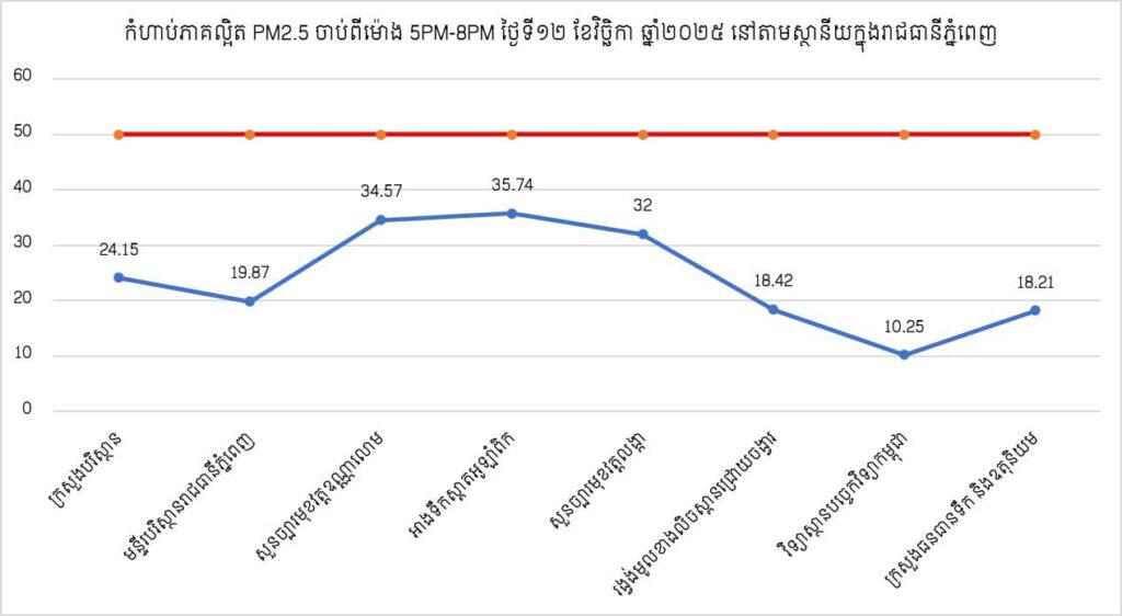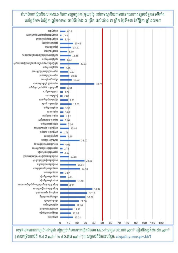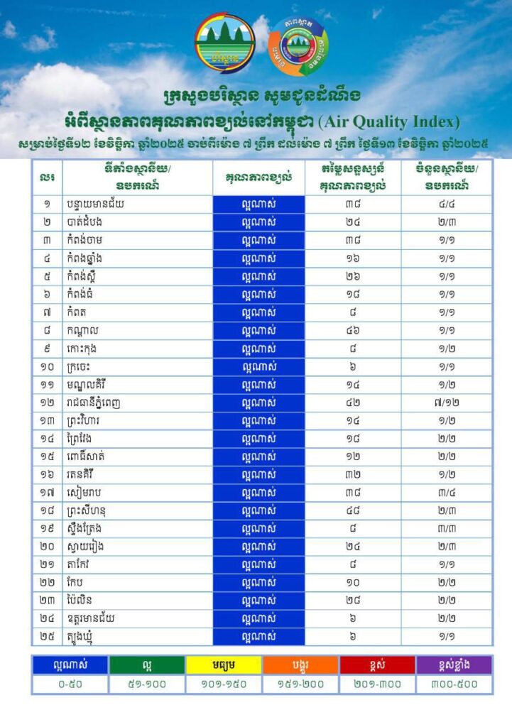 ជាមួយគ្នានេះក្រសួងបរិស្ថានបញ្ជាក់ថាស្ថានភាពគុណភាពខ្យល់នៅក្នុងព្រះរាជាណាចក្រកម្ពុជា សម្រាប់ថ្ងៃទី១២ ខែវិច្ឆិកា ឆ្នាំ២០២៥ ចាប់ពីម៉ោង ៧ ព្រឹក ដល់ម៉ោង ៧ ព្រឹក ថ្ងៃទី១៣ ខែវិច្ឆិកា ឆ្នាំ២០២៥ ដែលមានកំហាប់ភាគ ល្អិតនិចលគិតជាមធ្យមស្មើនឹង ១២.៣៦ µg/m3 ធៀបនឹងស្តង់ដារ ៥០ µg/m3 និងគិតជាសន្ទស្សន៍ គុណភាពខ្យល់ (Air Quality Index) គឺ “ល្អណាស់”។