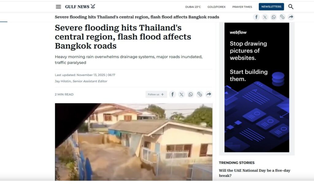 យោងតាមការចេញផ្សាយ របស់សារព័ត៌មាន Gulfnews, ប៉ូលីសក្រុងបាងកក បានបិទផ្លូវមួយចំនួន នៅថ្ងៃព្រហស្បតិ៍ ទី១៣ ខែវិច្ឆិកា នេះ បន្ទាប់ពីទឹកជំនន់ភ្លាមៗ ឈានដល់កម្រិតគ្រោះថ្នាក់ ដោយជំរុញឱ្យអ្នកបើកបរ ស្វែងរកផ្លូវជំនួស។ ទីក្រុងនេះបានជួបប្រទះនឹងភ្លៀងធ្លាក់ខ្លាំង នៅពេលព្រឹកព្រលឹម ដែលធ្វើឲ្យប្រព័ន្ធលូបង្ហូរលើសលុប ធ្វើឱ្យផ្លូវសំខាន់ៗមួយចំនួនត្រូវជន់លិច។