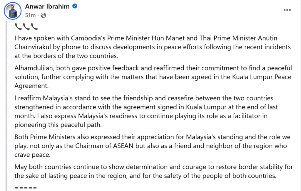 ឯកឧត្តម អាន់វ៉ា អ៊ីប្រាហ៊ីម នាយករដ្ឋមន្ត្រីម៉ាឡេស៊ី និងជាប្រធានអាស៊ាន បានជួបពិភាក្សាជាមួយសម្ដេចធិបតី ហ៊ុន ម៉ាណែត នាយករដ្ឋមន្ត្រីកម្ពុជា និងឯកឧត្ដម អានូទិន ឆានវីរកូល នាយករដ្ឋមន្ត្រីថៃ ដើម្បីពិភាក្សាអំពីការវិវត្តចុងក្រោយនៃកិច្ចខិតខំប្រឹងប្រែងដើម្បីសន្តិភាព បន្ទាប់ពីមានហេតុការណ៍ថ្មីៗនេះ នៅតាមបណ្ដោយព្រំដែនរួមរបស់ប្រទេសទាំងពីរ។