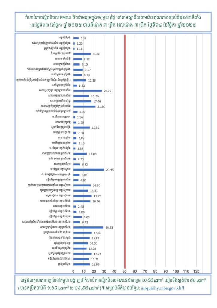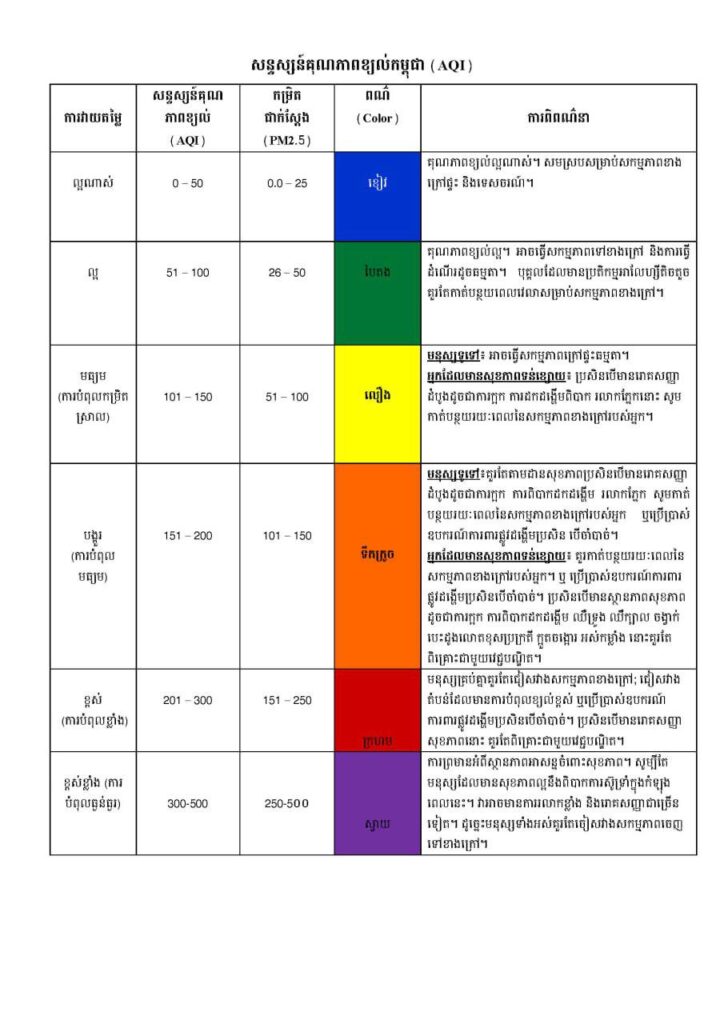 ក្រសួងបរិស្ថានសូមជម្រាបជូនថា មន្រ្តីក្រសួងបរិស្ថានបានធ្វើការតាមដានគុណភាពខ្យល់នៅកម្ពុ ជាប្រចាំ រយៈពេល ២៤ម៉ោងលើ ២៤ម៉ោង រៀងរាល់ថ្ងៃ តាមរយៈឧបករណ៍តាមដានគុណភាពខ្យល់ ចំនួន ៥៩ទីតាំងនៅទូទាំងប្រទេស ក្នុងនោះនៅរាជធានីភ្នំពេញ មាន ១០ទីតាំង រួមជាមួយស្ថានីយផ្កាយរណបចំនួន១ គ្រឿង និងរថយន្តចល័តចំនួន ៣គ្រឿង។ ក្នុងរយៈកន្លងមកនេះ ទិន្នន័យគុណភាពខ្យល់នៅកម្ពុជា មានភាពល្អប្រសើរ ពោលគឺស្ថិតនៅក្រោមបន្ទាត់ក្រហមនៃស្តង់ដារជាតិស្តីពីគុណភាពខ្យល់ ។