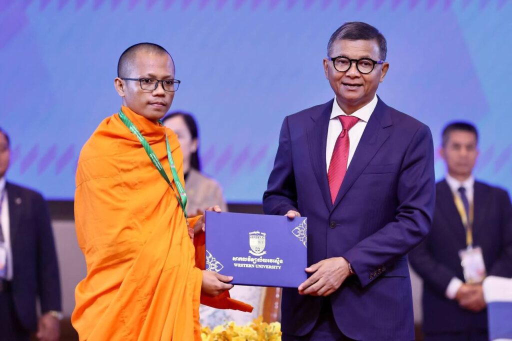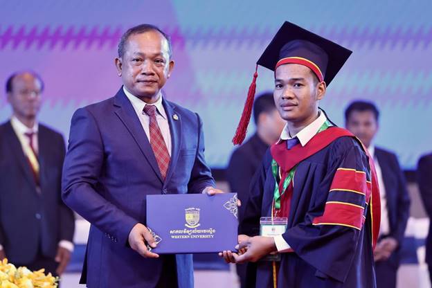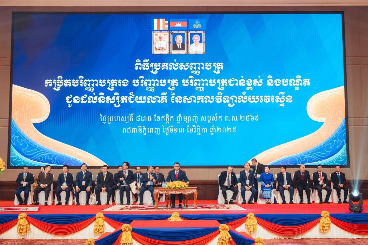 រាជធានីភ្នំពេញ៖ នាព្រឹកថ្ងៃទី១៣ ខែវិច្ឆិកា ឆ្នាំ២០២៥ ឯកឧត្តមបណ្ឌិតសភាចារ្យ ហង់ជួន ណារ៉ុន ឧបនាយករដ្ឋមន្ត្រី រដ្ឋមន្ត្រីក្រសួងអប់រំ យុវជន និងកីឡា តំណាងដ៏ខ្ពង់ខ្ពស់ សម្តេចមហាបវរធិបតី ហ៊ុន ម៉ាណែត នាយករដ្ឋមន្រ្តី នៃព្រះរាជាណាចក្រកម្ពុជា បានអញ្ជើញជាអធិបតីក្នុងពិធី ប្រគល់សញ្ញាបត្រ កម្រិតបរិញ្ញាបត្ររង បរិញ្ញាបត្រ បរិញ្ញាបត្រជាន់ខ្ពស់ និងបណ្ឌិត ជូនដល់និស្សិតជ័យលាភី នៃសាកលវិទ្យាល័យវេស្ទើន និងមានការអញ្ជើញចូលរួមពីសំណាក់ ឯកឧត្តម លោកជំទាវ ថ្នាក់ដឹកនាំក្រសួងអប់រំ យុវជន និងកីឡា ឯកឧត្តម តែ ឡូរិន ប្រធានក្រុម ប្រឹក្សា ភិបាល នៃសាកលវិទ្យាល័យវេស្ទើន សាកលវិទ្យាធិការ លោក លោកស្រី ក្រុមប្រឹក្សាភិបាល គណៈគ្រប់គ្រង បុគ្គលិកអប់រំ សាស្រ្តាចារ្យ មន្រ្តីរាជការ លោកគ្រូ អ្នកគ្រូ មាតាបិតា អ្នកអាណាព្យាបាល និងសិស្សានុសិស្សជ័យលាភីប្រមាណ ៣,៣៥២ អង្គ/នាក់។