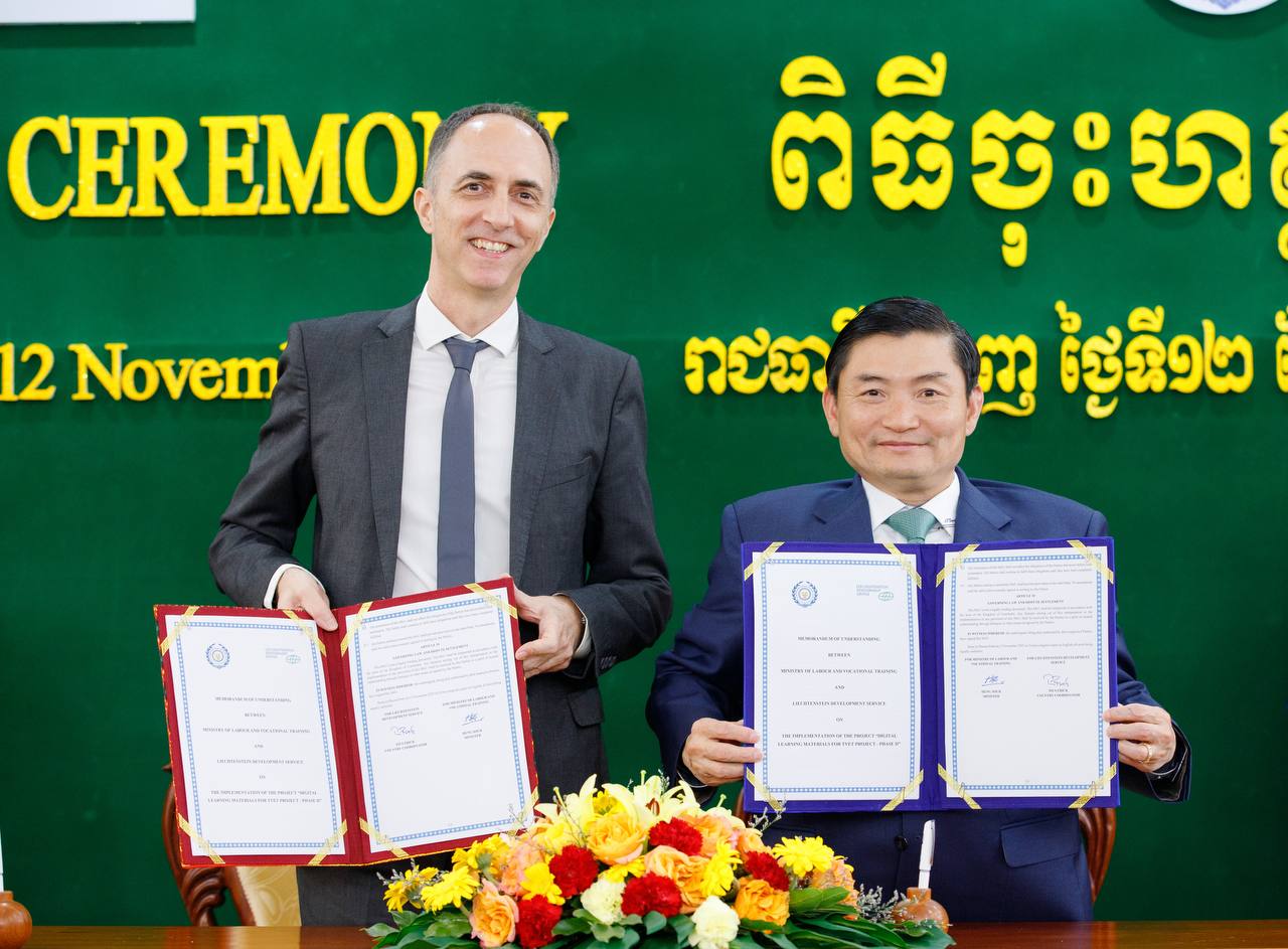 (ភ្នំពេញ)៖ ឯកឧត្តម ហេង សួរ រដ្ឋមន្ត្រីក្រសួងការងារ និងបណ្តុះបណ្តាលវិជ្ជាជីវៈ និង លោក Pius Frick អ្នកសម្របសម្រួលប្រចាំប្រទេសរបស់ភា្នក់ងារអភិវឌ្ឍន៍លិចតិនស្តាញ (Liechtenstein Development Service – LED) បានចុះអនុស្សរណៈស្តីពីការអនុវត្តគម្រោង “សម្ភារៈសិក្សាឌីជីថលសម្រាប់ អ.ប.វ.- ដំណាក់កាលទី២” នារសៀលថ្ងៃទី១២ ខែវិច្ឆិកា ឆ្នាំ២០២៥ នៅទីស្តីការក្រសួងការងារ និងបណ្តុះបណ្តាលវិជ្ជាជីវៈ។
