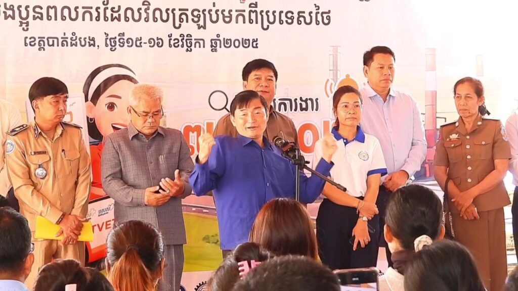 បាត់ដំបង៖ឱកាសការងារប្រមាណជាងមួយម៉ឺនកន្លែងសម្រាប់ផ្តល់ជូនប្រជាពលរដ្ឋ និងពលករខ្មែរដែលវិលត្រឡប់មក ប្រទេសវិញ ត្រូវបានរៀបចំបង្ហាញផ្ទាល់នៅស្រុកថ្មគោល ខេត្តបាត់ដំបងកាលពីចុងសប្ដាហ៍ ។មានន័យថា បានយក