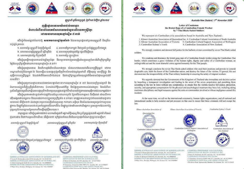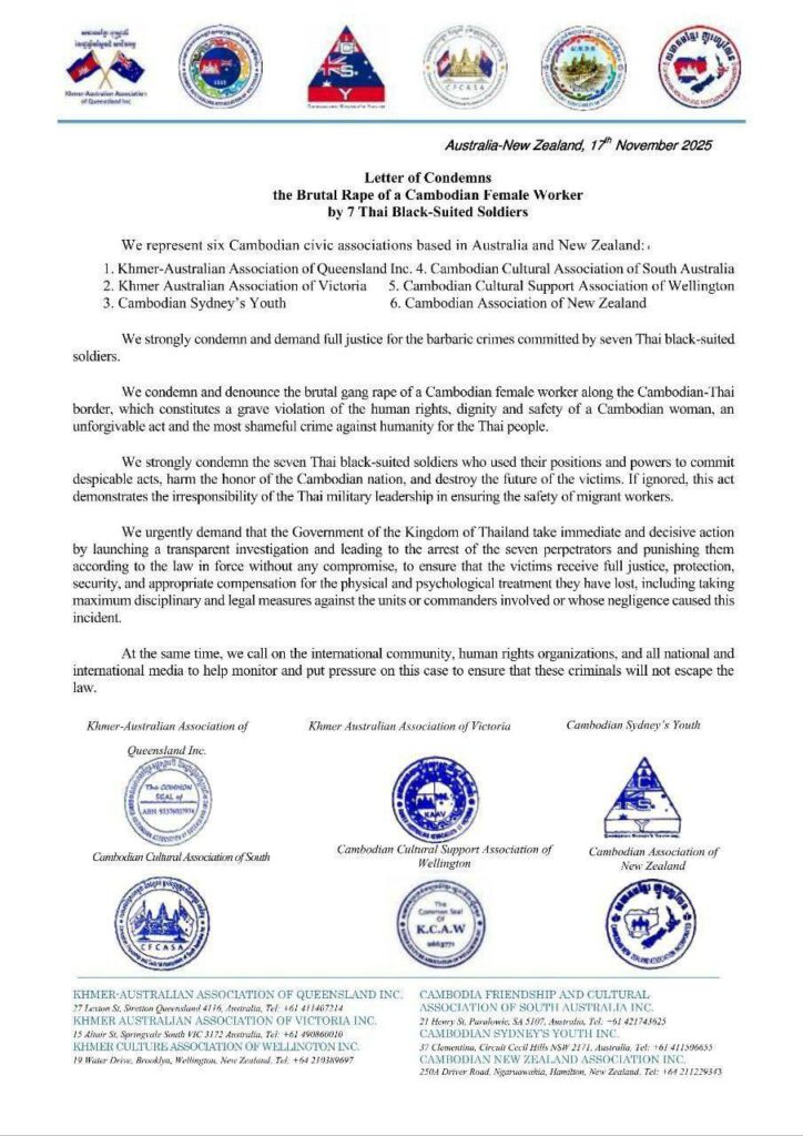 សមាគមពលរដ្ឋខ្មែរទាំង៦ ដែលមានមូលដ្ឋាននៅប្រទេសអូស្ត្រាលី និងនូវែល- ហ្សេឡង់ ថ្កោលទោស និងបរិហារនូវអំពើចាប់រំលោភជាក្រុមយ៉ាងសាហាវឃោរឃៅលើពលករស្ត្រីខ្មែរម្នាក់ នៅតាម បណ្តោយតំបន់ព្រំដែនកម្ពុជា-ថៃ ដែលទង្វើនេះបានបង្ហាញឱ្យឃើញពីការបំពានយ៉ាងធ្ងន់ធ្ងរទៅលើ សិទ្ធិមនុស្ស សេចក្តីថ្លៃថ្នូរ និង សុវត្ថិភាពរបស់ស្ត្រីខ្មែរម្នាក់ ដែលជាអំពើមិនអាចលើកលែងបាន និងជាឧក្រិដ្ឋកម្មប្រឆាំងមនុស្សជាតិដ៏អាម៉ាស់បំផុតសម្រាប់ជាតិ សាសន៍ថៃ។ ប្រកាសថ្កោលទោសយ៉ាងដាច់អហង្ការចំពោះទាហានឈុតខ្មៅសៀម ៧ នាក់ ដែលបានប្រើប្រាស់តួនាទី និង អំណាចរបស់ខ្លួនដើម្បីប្រព្រឹត្តអំពើថោកទាប ប៉ះពាល់ដល់កិត្តិយសជាតិខ្មែរ និងបំផ្លាញអនាគតរបស់ជនរងគ្រោះ ដែលអំពើនេះ ប្រសិនបើត្រូវបានព្រងើយកន្តើយនោះបង្ហាញពីការមិនទទួលខុសត្រូវរបស់ថ្នាក់ដឹកនាំយោធាថៃក្នុងការធានាសុវត្ថិភាពដល់ពលករឆ្លងដែន។